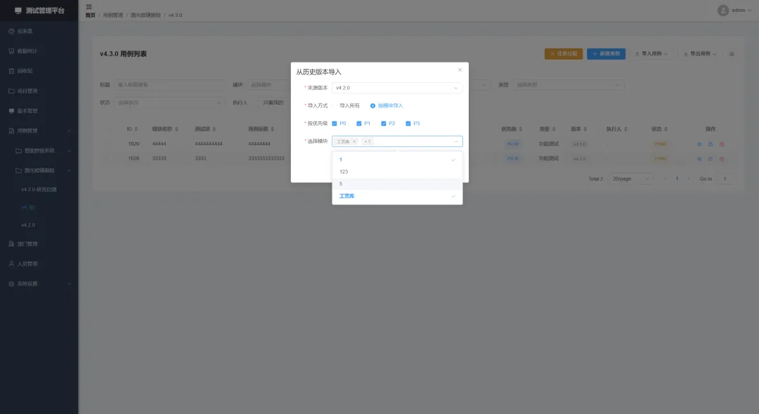 • 颗粒化历史导入:支持 按版本 甚至 按模块 从历史库中精准提取用例,快速复用资产。 -