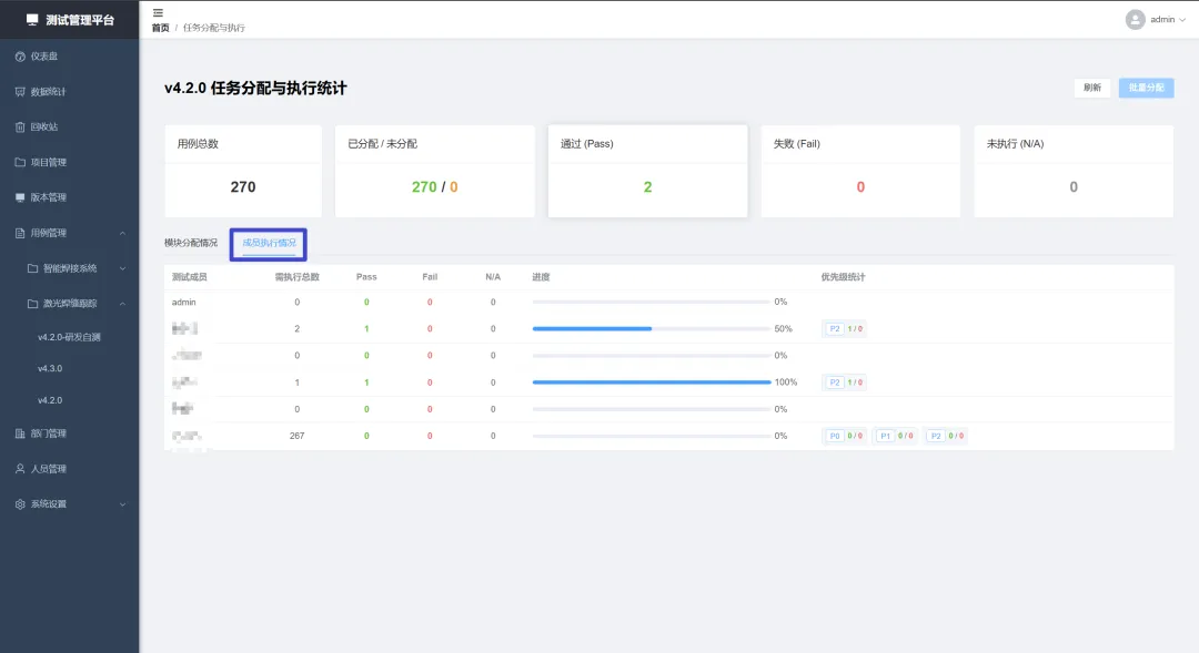 在成员执行情况,可以查看当前版本下,各项目测试用例的执行情况,以及详细的优先级。