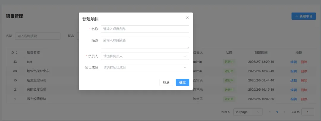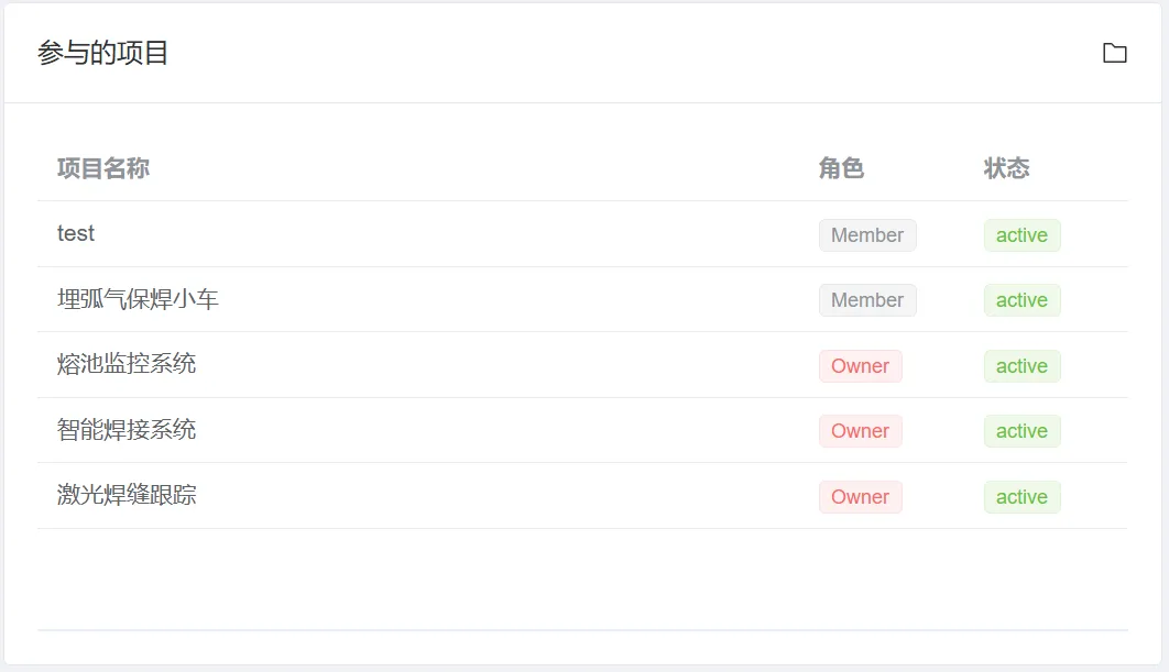 **功能说明:**用于展示当前用户已加入的项目列表,帮助用户查看在系统中的项目参与情况,包括项目名称、用户角色以及项目状态等信息。