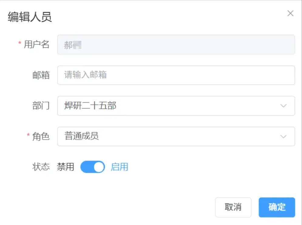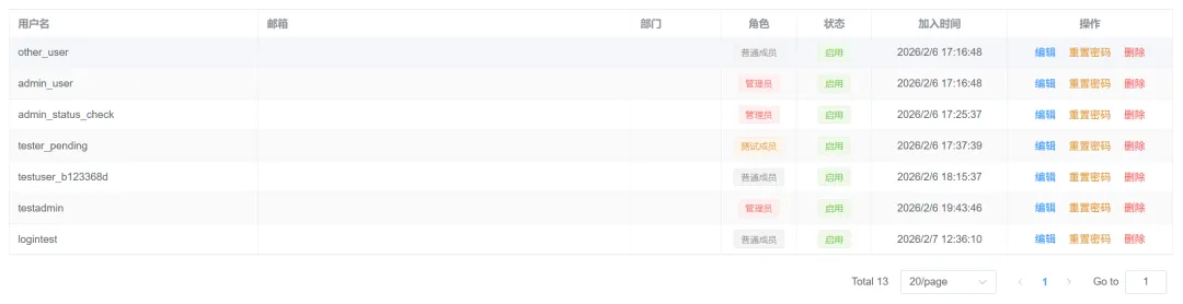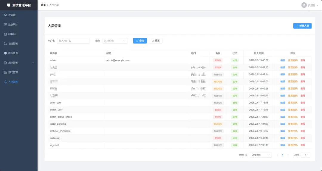 • **角色:**当前用户的角色权限,包括(普通成员、测试成员、管理员) -