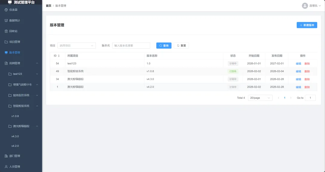 **功能说明:**删除不需要执行的版本,删除后,对应版本下的测试用例会被完全删除,请谨慎操作。