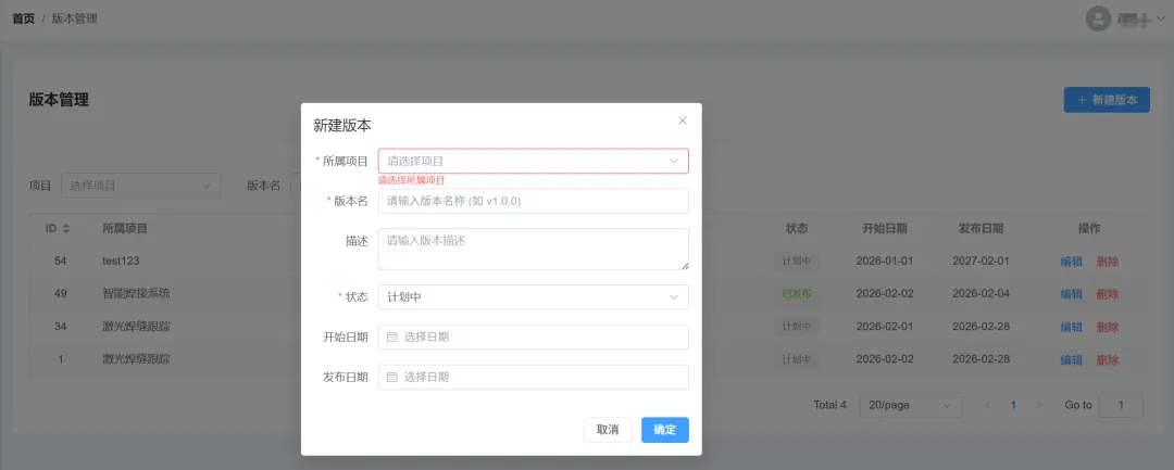 • **所属项目:**该版本需要关联的项目 -
