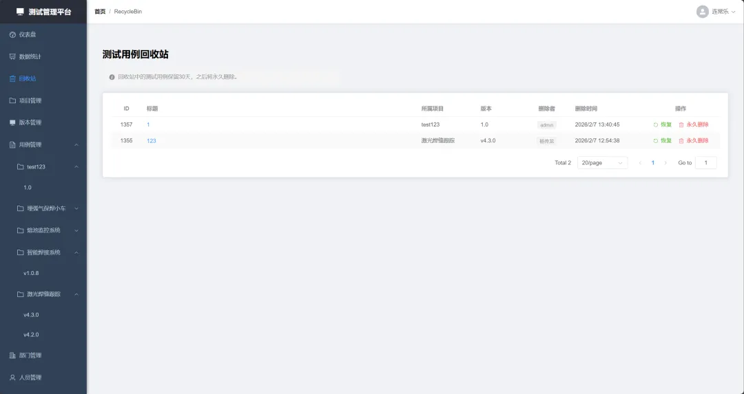 • 数据恢复:内置完善的 回收站机制。误删用例可随时查看详情并一键恢复;支持 30天自动清理。 -