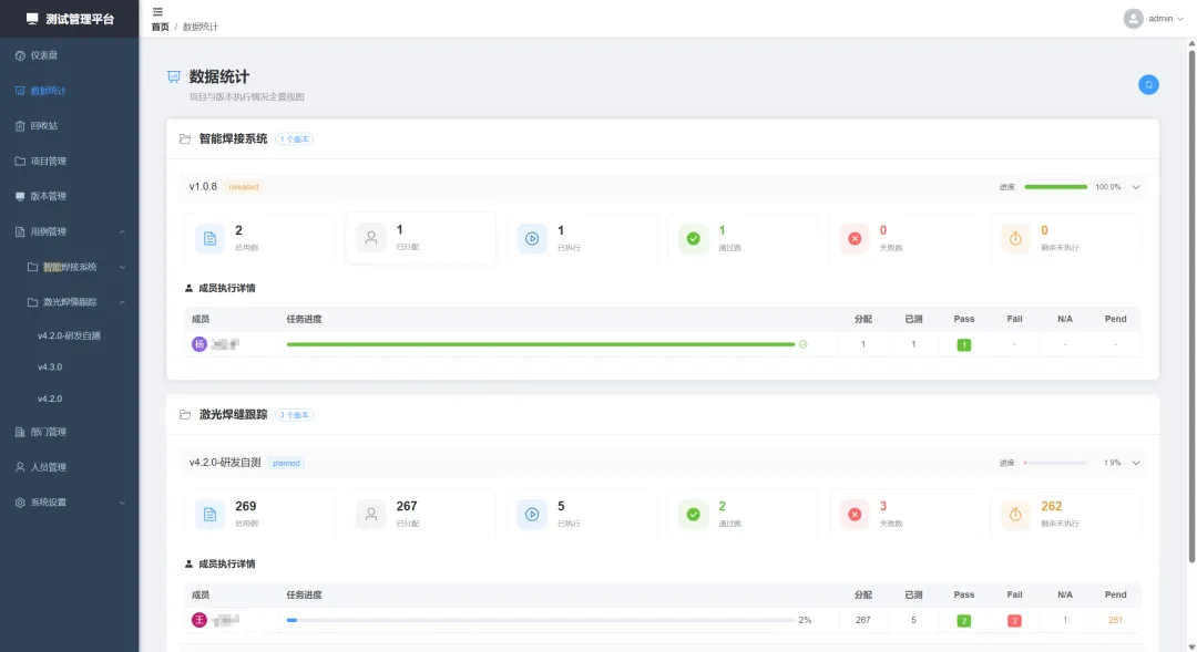 **功能说明:**用于统计当前各项目、成员测试用例的执行情况