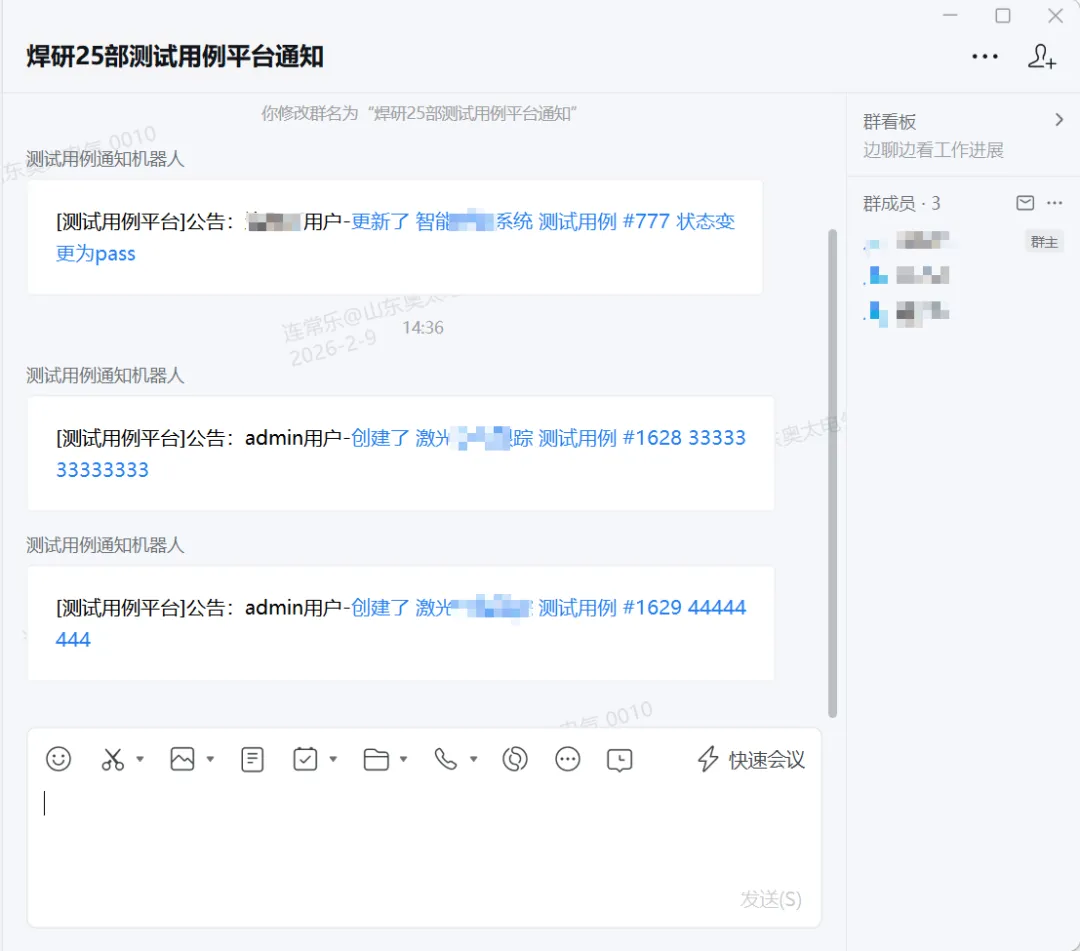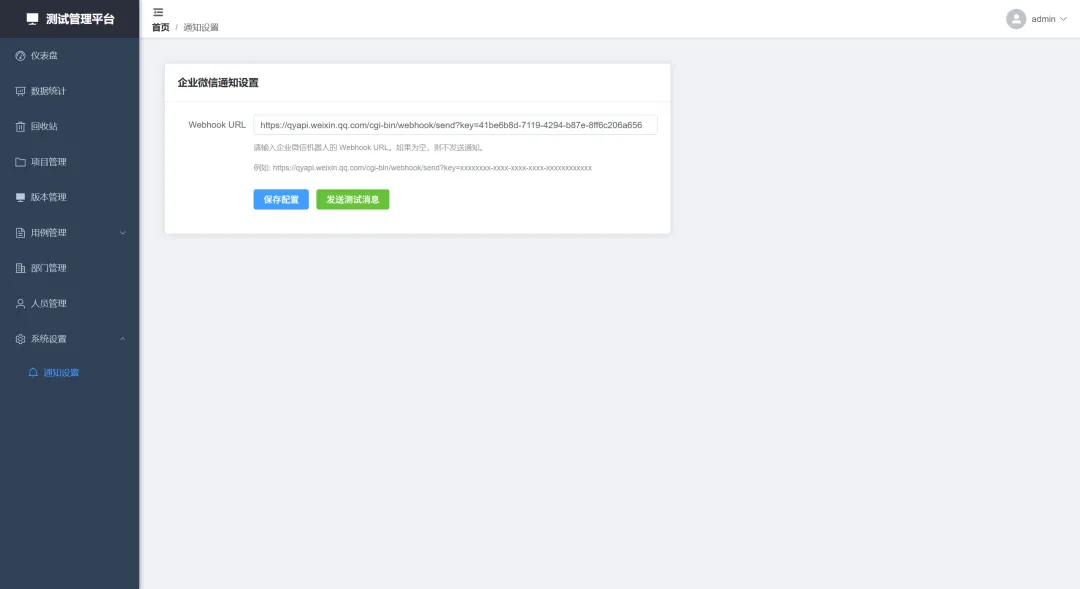 本测试系统集成企业微信群通知管理,通过配置机器人webhook,即可实现测试用例的实时更新。