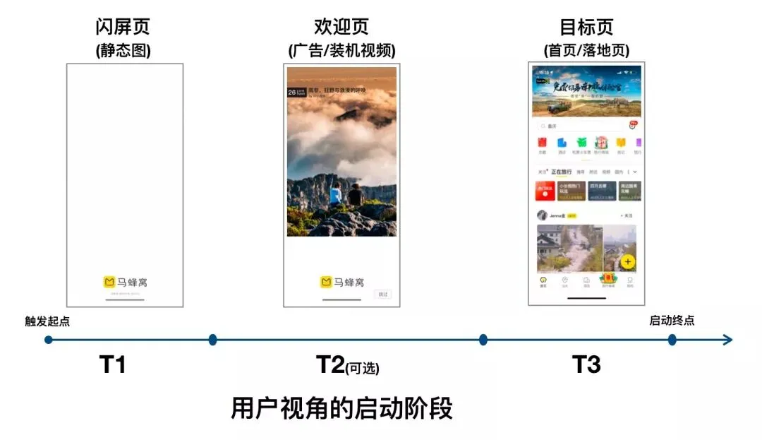 从用户视角定义启动,主要以用户主观视觉为依据,以页面流程为标准。这样看来,常见的 App 启动可以分为三个阶段: