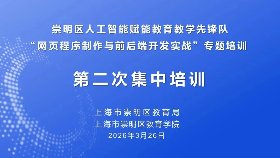 2026年3月26日,上海市第一聋哑学校吴晨老师为崇明区作“网页程序制作与前后端开发实战”专题培训,打造“课前-课中-课后”全链条互动学习模式。参加培训人员包括崇明区人工智能赋能教育教学百人先锋队、区教育学院学科教研员、区三个助手项目组成员,共计167人参加。
