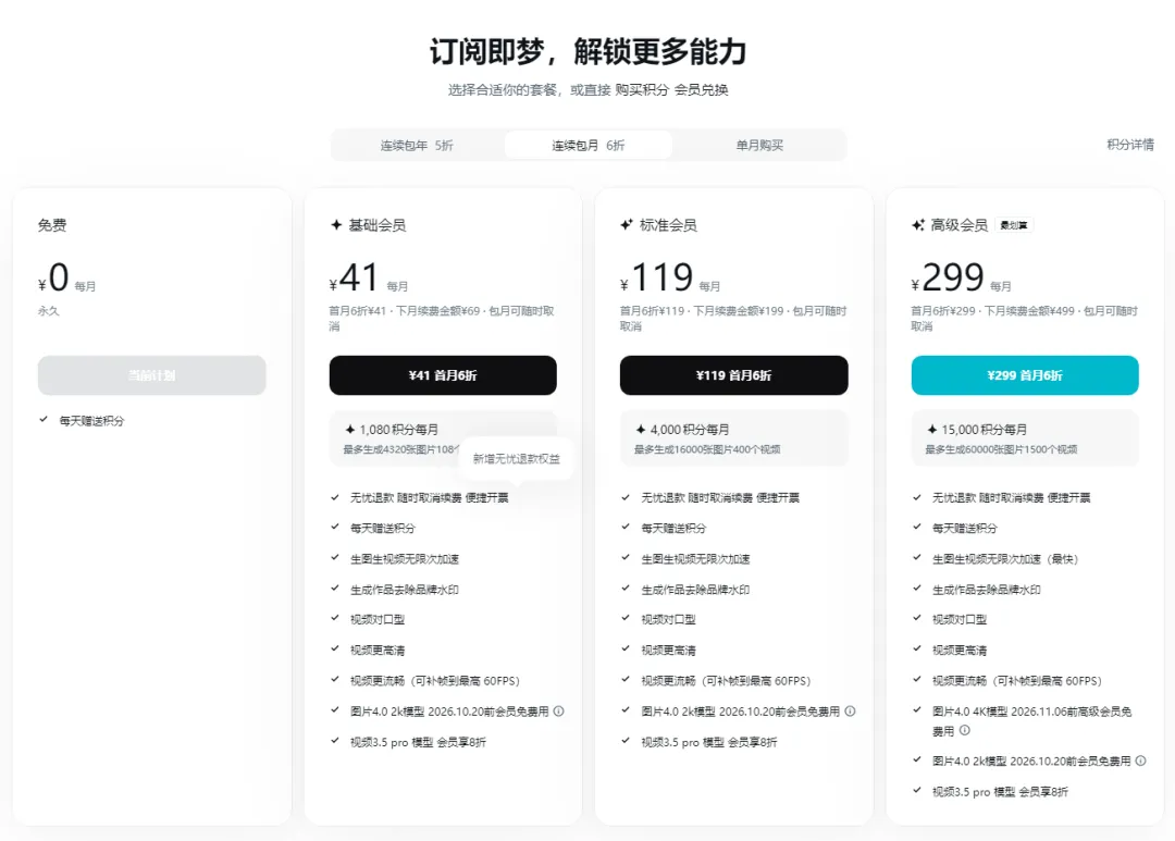 免费额度日常够用,会员69 元 / 月,无限出图 / 视频、去水印、高清导出