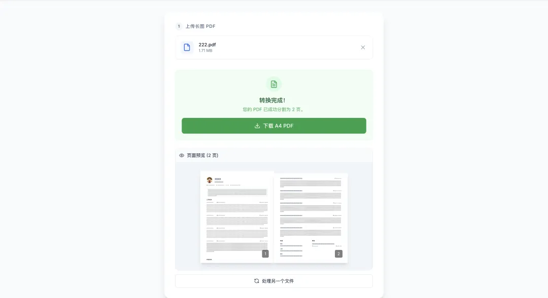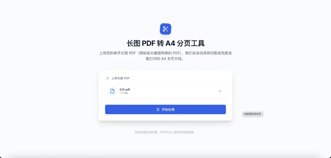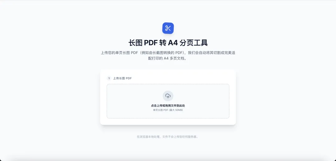 生成一个网页,这个网页可以进行PDF的处理,1、用户可以上传一个原始的单页PDF长图。2、点击开始处理后,可以将上传的单页长图PDF按照A4纸的尺寸处理成多页的PDF。3、处理完成的PDF可以下载到本地。