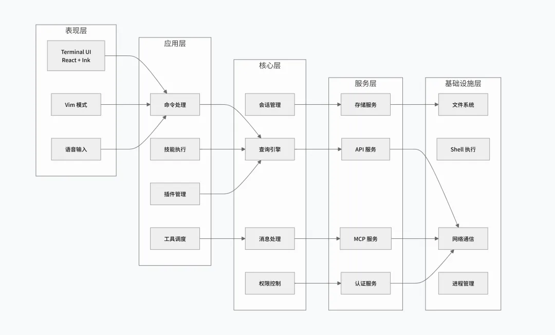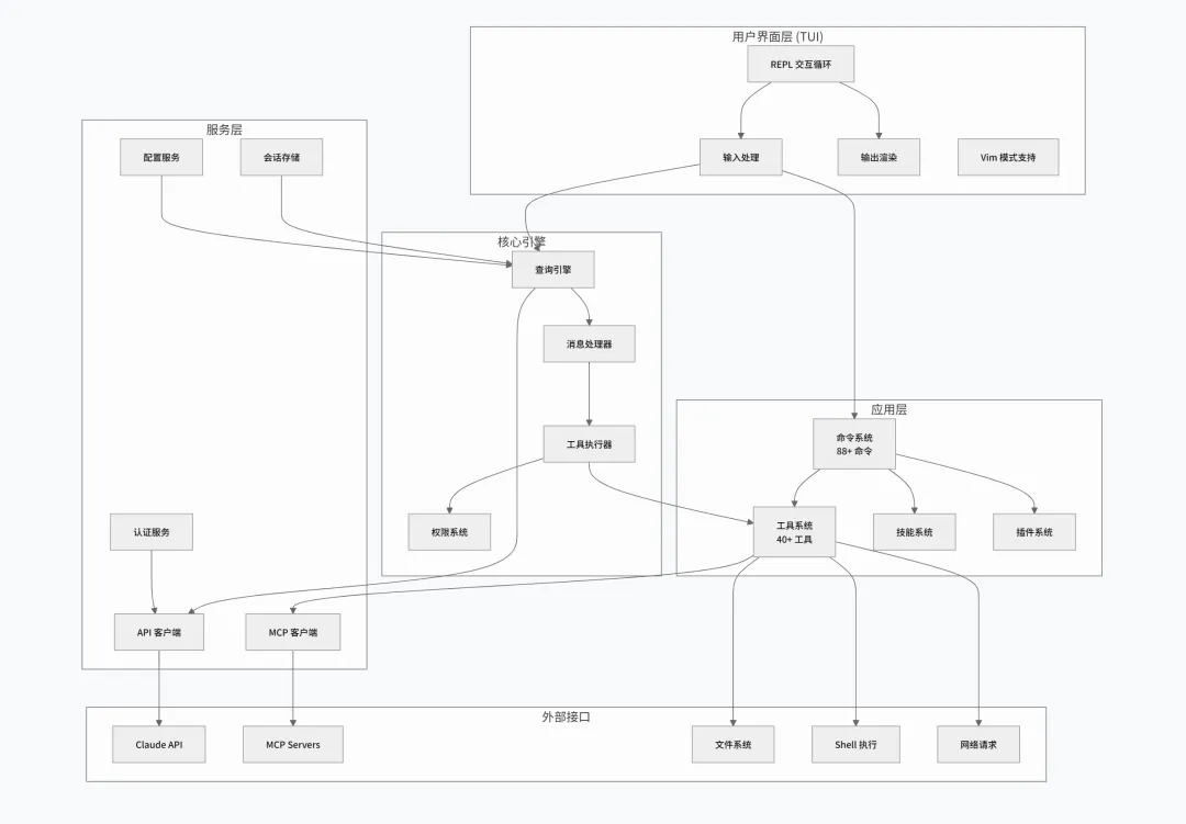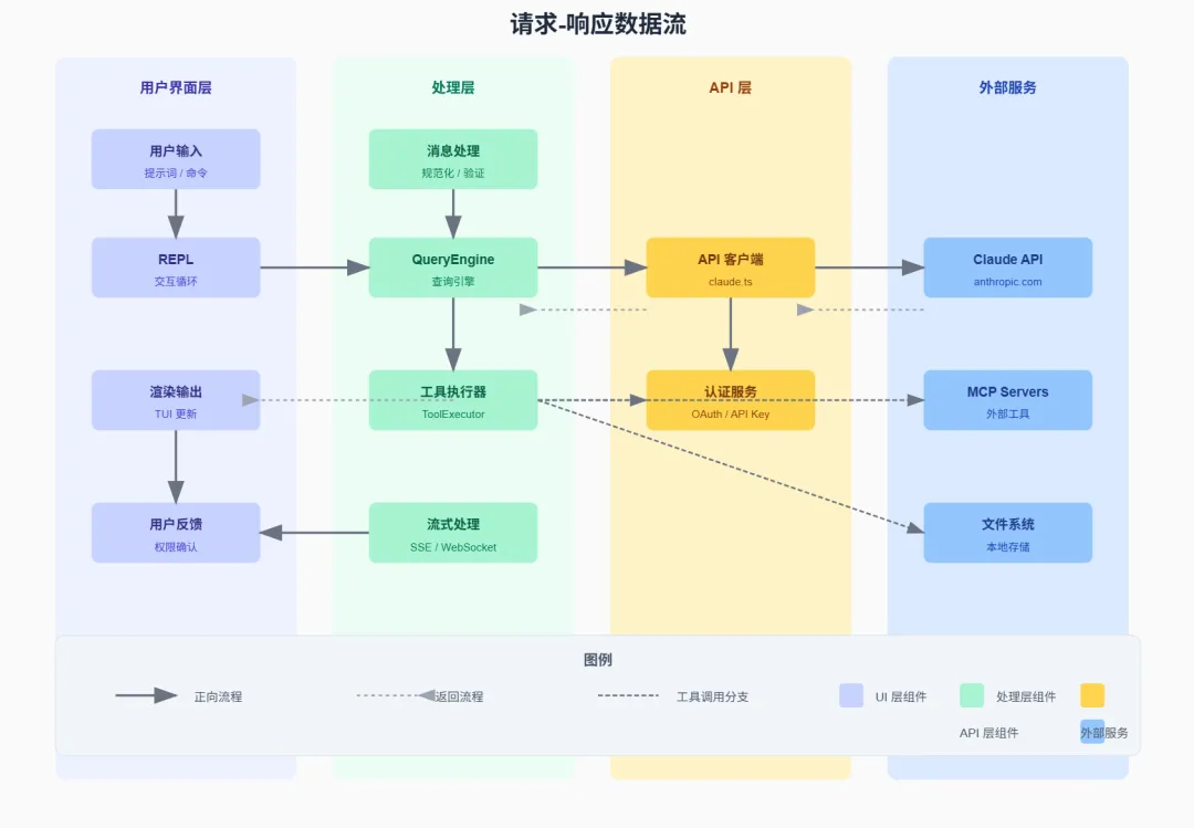 1 2 3 4 5 6 7 8 9 10 11 12 13 14 15 16 17 ┌─────────────────────────────────────────────────────────────────┐│ 架构设计原则 │├─────────────────────────────────────────────────────────────────┤│ ││ 1. 模块化设计 各功能模块独立,低耦合高内聚 ││ ││ 2. 插件化扩展 工具、命令、MCP 服务均可独立扩展 ││ ││ 3. 流式处理 所有 I/O 采用流式设计,支持实时响应 ││ ││ 4. 权限控制 细粒度权限系统,安全执行用户操作 ││ ││ 5. 特性开关 编译时特性门控,区分内外部版本 ││ ││ 6. 状态驱动 响应式状态管理,UI 自动更新 ││ │└─────────────────────────────────────────────────────────────────┘