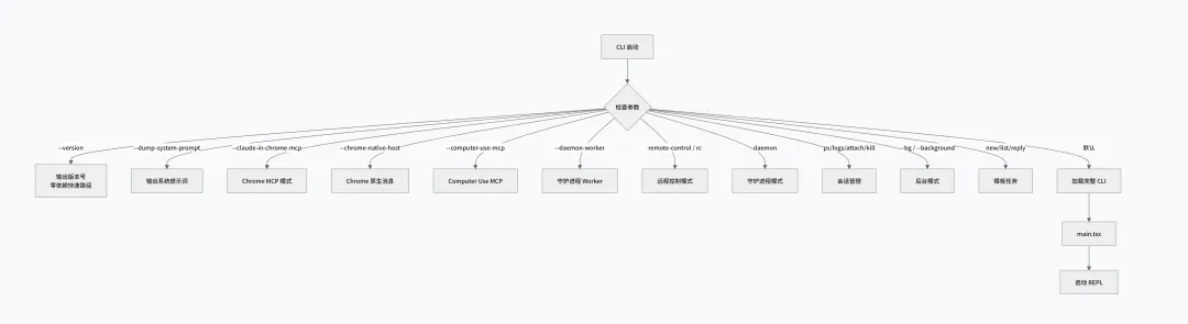 1 2 3 4 5 6 7 8 9 10 11 12 13 14 15 16 17 18 19 20 21 22 23 24 25 26 27 28 29 30 // cli.tsx 核心逻辑async function main() { // 1. 快速路径:版本号输出(零导入) if (args.includes('--version')) { console.log(VERSION) return } // 2. 特殊模式路由 if (args.includes('--dump-system-prompt')) { // 输出渲染后的系统提示词 await dumpSystemPrompt() return } // 3. MCP 服务器模式 if (args.includes('--claude-in-chrome-mcp')) { await startChromeMCPServer() return } // 4. 远程控制模式 if (args.includes('remote-control') || args.includes('rc')) { await startBridgeMode() return } // 5. 默认:加载完整 CLI await import('./main.js')}