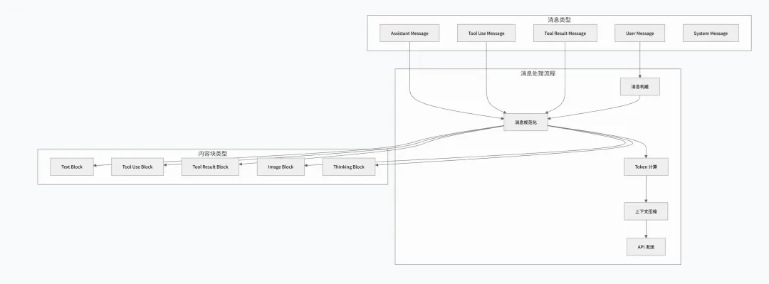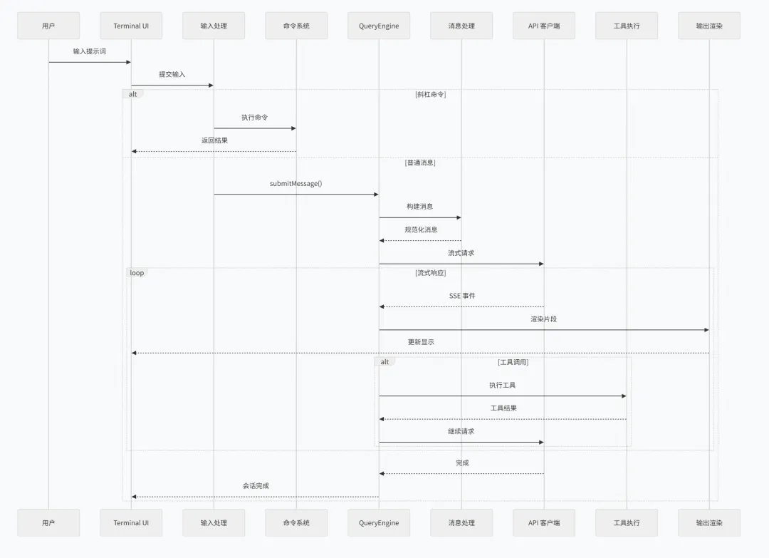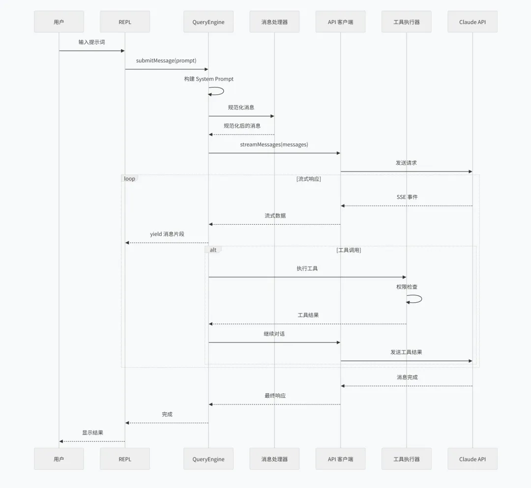 1 2 3 4 5 6 7 8 9 10 11 12 13 14 15 16 17 18 19 20 21 22 23 24 25 26 27 28 29 30 31 32 33 34 35 36 export class QueryEngine { private config: QueryEngineConfig private mutableMessages: Message[] private abortController: AbortController private permissionDenials: SDKPermissionDenial[] private totalUsage: NonNullableUsage private readFileState: FileStateCache async *submitMessage(prompt: string): AsyncGenerator<SDKMessage> { // 1. 构建用户消息 const userMessage = await this.buildUserMessage(prompt) this.mutableMessages.push(userMessage) // 2. 获取系统提示词 const systemPrompt = await getSystemPrompt() // 3. 规范化消息 const normalizedMessages = normalizeMessagesForAPI( this.mutableMessages, this.config ) // 4. 调用 API const stream = streamMessages({ messages: normalizedMessages, system: systemPrompt, tools: this.getEnabledTools(), ...this.config }) // 5. 处理流式响应 for await (const event of stream) { yield* this.processStreamEvent(event) } }}