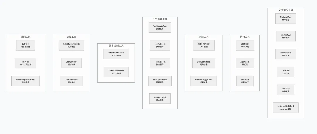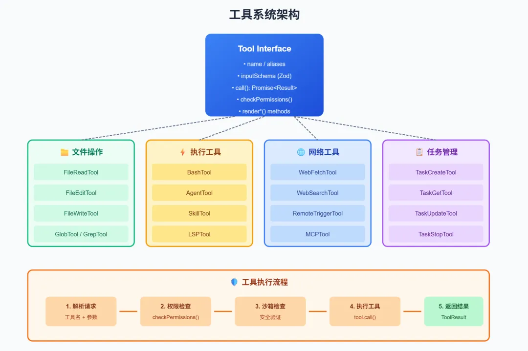 1 2 3 4 5 6 7 8 9 10 11 12 13 14 15 16 17 18 19 20 21 22 23 24 25 26 27 28 29 30 31 32 33 34 35 36 37 38 39 40 41 42 43 export type Tool<Input, Output, P> = { // 基础属性 name: string // 工具名称 aliases?: string[] // 别名列表 searchHint?: string // 搜索提示 // 模式定义 inputSchema: Input // Zod 输入模式 inputJSONSchema?: JSONSchema // JSON Schema // 核心方法 call(): Promise<ToolResult<Output>> // 执行工具 description(): Promise<string> // 获取描述 // 状态检查 isEnabled(): boolean // 是否启用 isReadOnly(): boolean // 是否只读 isDestructive?(): boolean // 是否破坏性 isConcurrencySafe(): boolean // 是否并发安全 // 权限 checkPermissions(): Promise<PermissionResult> // 验证 validateInput?(): Promise<ValidationResult> // 渲染 renderToolUseMessage(): React.ReactNode renderToolResultMessage(): React.ReactNode // 可选扩展方法 queueConcurrencyKey?(): string | undefined renderProgress?(): React.ReactNode updateProgress?(): void signal?(): AbortSignal formatResult?(): string shouldDeferToolUse?(): Promise<boolean> performNetworkRequest?(): Promise<unknown> updateEstimatedProgress?(): void getUnsafeToolUseMessage?(): string forcePromptCaching?(): boolean // ... 更多可选方法}