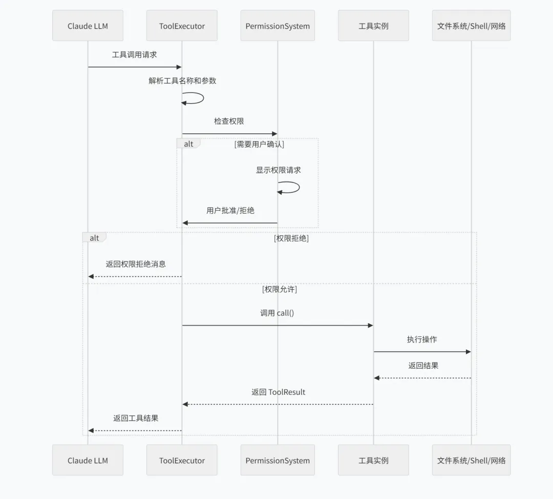 1 2 3 4 5 6 7 8 9 10 11 12 13 14 15 16 17 18 19 20 21 22 23 24 25 26 27 28 29 // MCP 工具包装器export class MCPTool { constructor( private serverName: string, private tool: MCPToolDefinition ) {} async call(input: unknown): Promise<ToolResult> { // 1. 获取 MCP 客户端 const client = await this.getMCPClient() // 2. 调用 MCP 工具 const result = await client.callTool({ name: this.tool.name, arguments: input }) // 3. 处理结果 return { content: result.content, isError: result.isError } } checkPermissions() { // MCP 工具权限检查 return checkMCPPermission(this.serverName, this.tool.name) }}