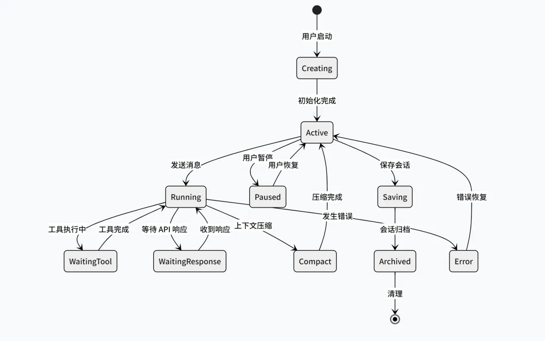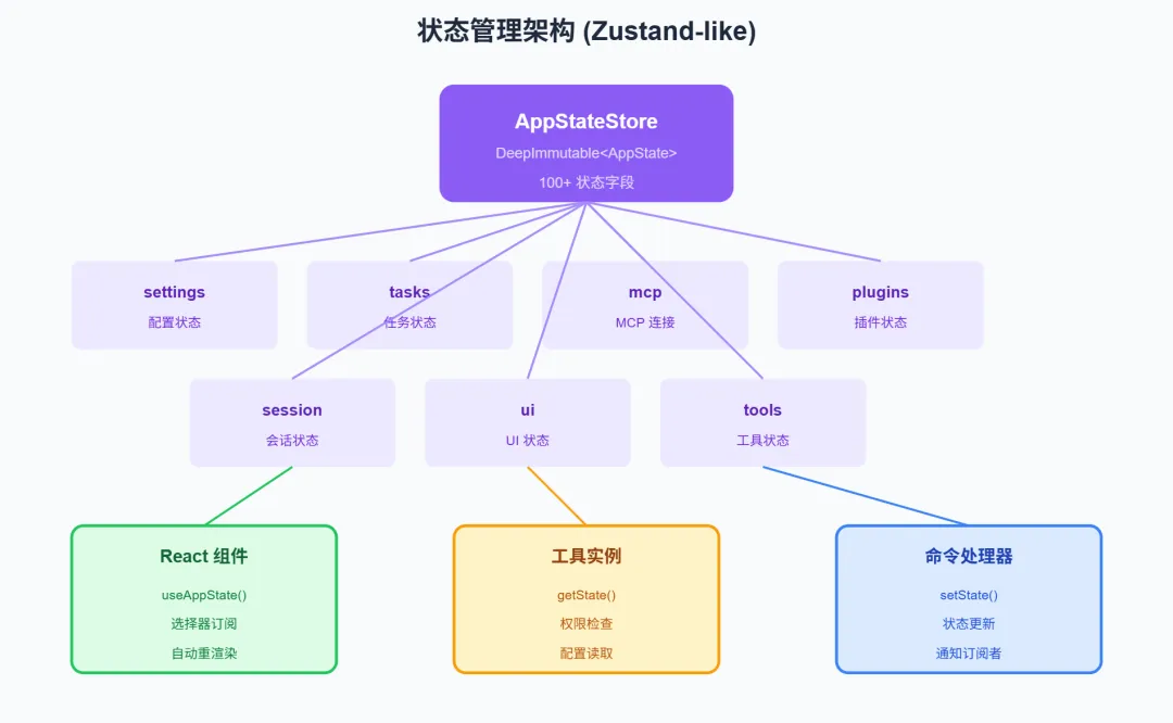 1 2 3 4 5 6 7 8 9 10 11 12 13 14 15 16 17 18 19 20 21 22 23 24 25 26 27 28 29 30 31 32 33 34 35 36 37 38 39 40 41 42 43 44 45 46 47 48 49 50 51 52 53 54 55 56 export type AppState = DeepImmutable<{ // 设置 settings: SettingsJson // 任务管理 tasks: { [taskId: string]: TaskState } // MCP mcp: { clients: Map<string, MCPClientState> tools: Map<string, MCPToolDefinition> commands: Map<string, MCPCommandDefinition> resources: Map<string, MCPResourceDefinition> } // 插件 plugins: { enabled: Set<string> disabled: Set<string> commands: Map<string, PluginCommand> errors: Map<string, string> } // 会话 session: { id: string messages: Message[] usage: Usage status: SessionStatus } // UI ui: { mode: 'normal' | 'vim' | 'voice' theme: ThemeName showHelp: boolean scrollPosition: number } // 工具 tools: { enabled: Set<string> permissions: Map<string, PermissionState> } // 缓存 cache: { fileContents: Map<string, string> fileHashes: Map<string, string> embeddings: Map<string, number[]> } // ... 100+ 状态字段}>