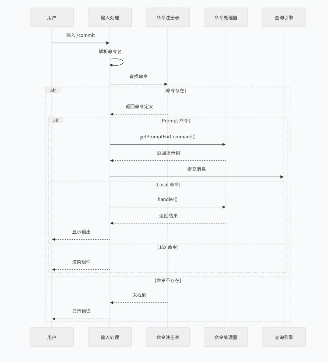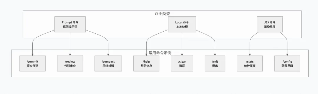1 2 3 4 5 6 7 8 9 10 11 12 13 14 15 16 17 18 19 20 21 22 23 24 25 26 27 28 29 30 31 32 33 34 35 36 37 38 39 40 type Command = | { type: 'prompt' getPromptForCommand(): Promise<string> } | { type: 'local' handler(): Promise<LocalCommandResult> } | { type: 'jsx' component: React.FC }// 命令注册示例const commands: Record<string, Command> = { '/commit': { type: 'prompt', async getPromptForCommand() { // 获取 git diff const diff = await getGitDiff() return `请根据以下变更生成提交信息:\n${diff}` } }, '/help': { type: 'local', async handler() { return { output: generateHelpText(), exitCode: 0 } } }, '/stats': { type: 'jsx', component: StatsPanel }}