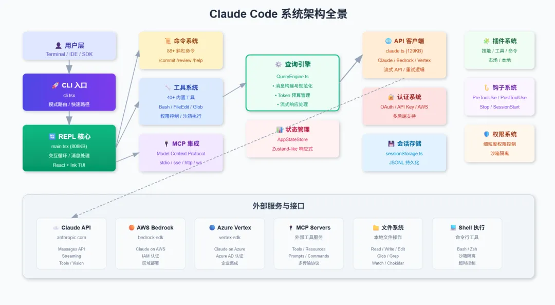 [1] 系统概述: #1-系统概述[2] 整体架构: #2-整体架构[3] 核心模块详解: #3-核心模块详解[4] 工具系统: #4-工具系统[5] MCP 集成: #5-mcp-集成[6] 状态管理: #6-状态管理[7] 认证系统: #7-认证系统[8] 会话管理: #8-会话管理[9] 命令系统: #9-命令系统[10] 插件系统: #10-插件系统[11] 数据流分析: #11-数据流分析[12] 技术栈: #12-技术栈[13] Claude Code 架构图解: #13-ClaudeCode架构图解