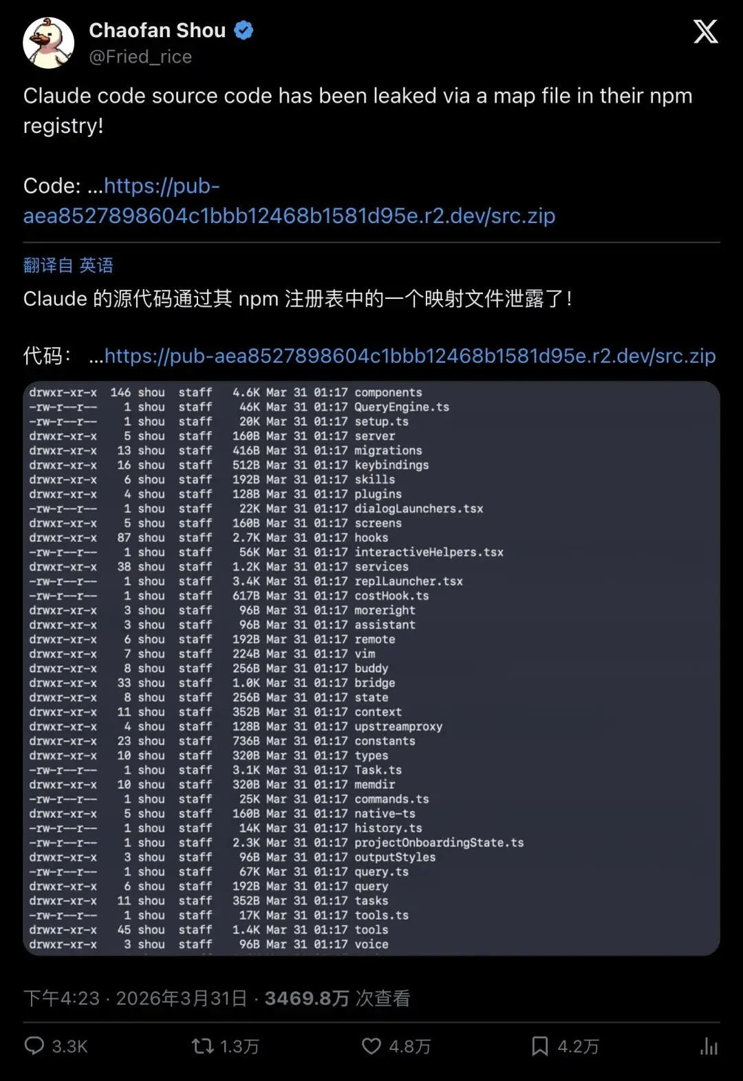 3月31日凌晨,安全研究员 Chaofan Shou(@Fried_rice)在 X 上发了一条帖子,瞬间引爆了整个科技圈。