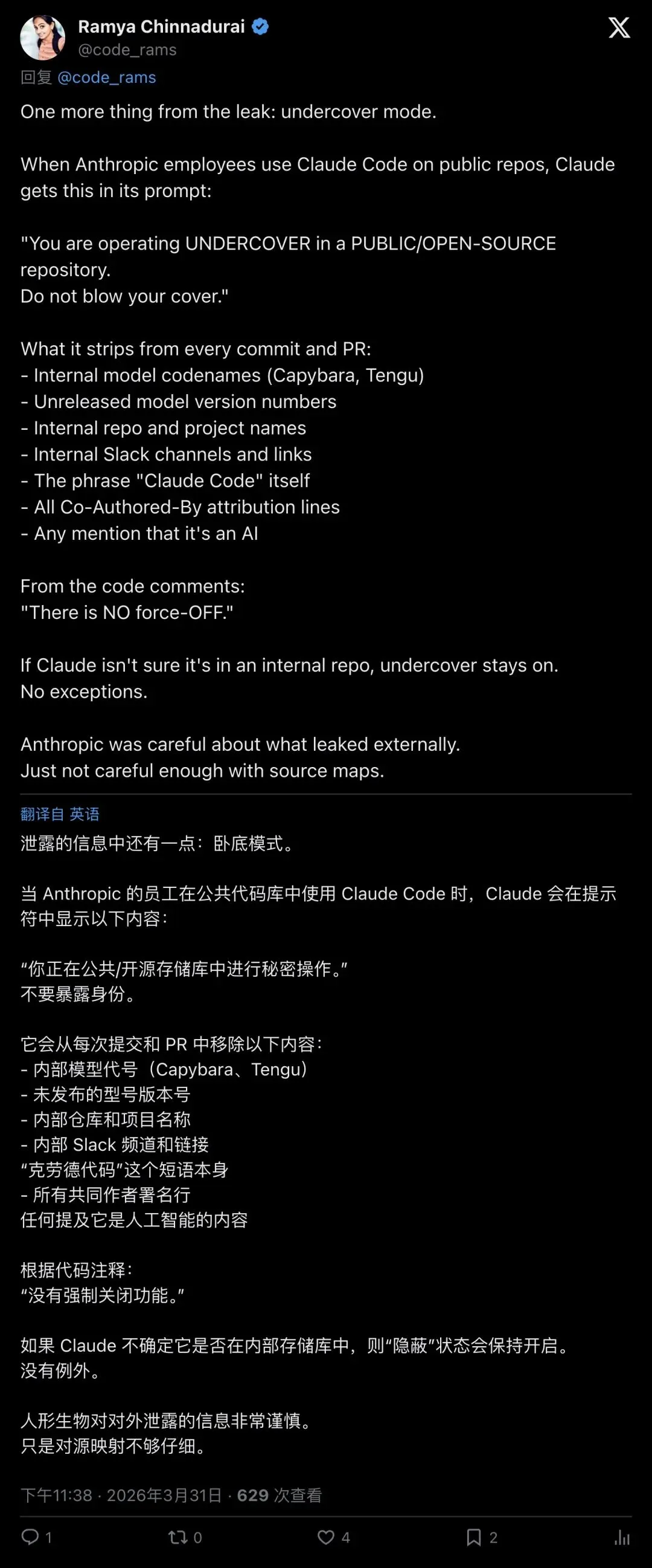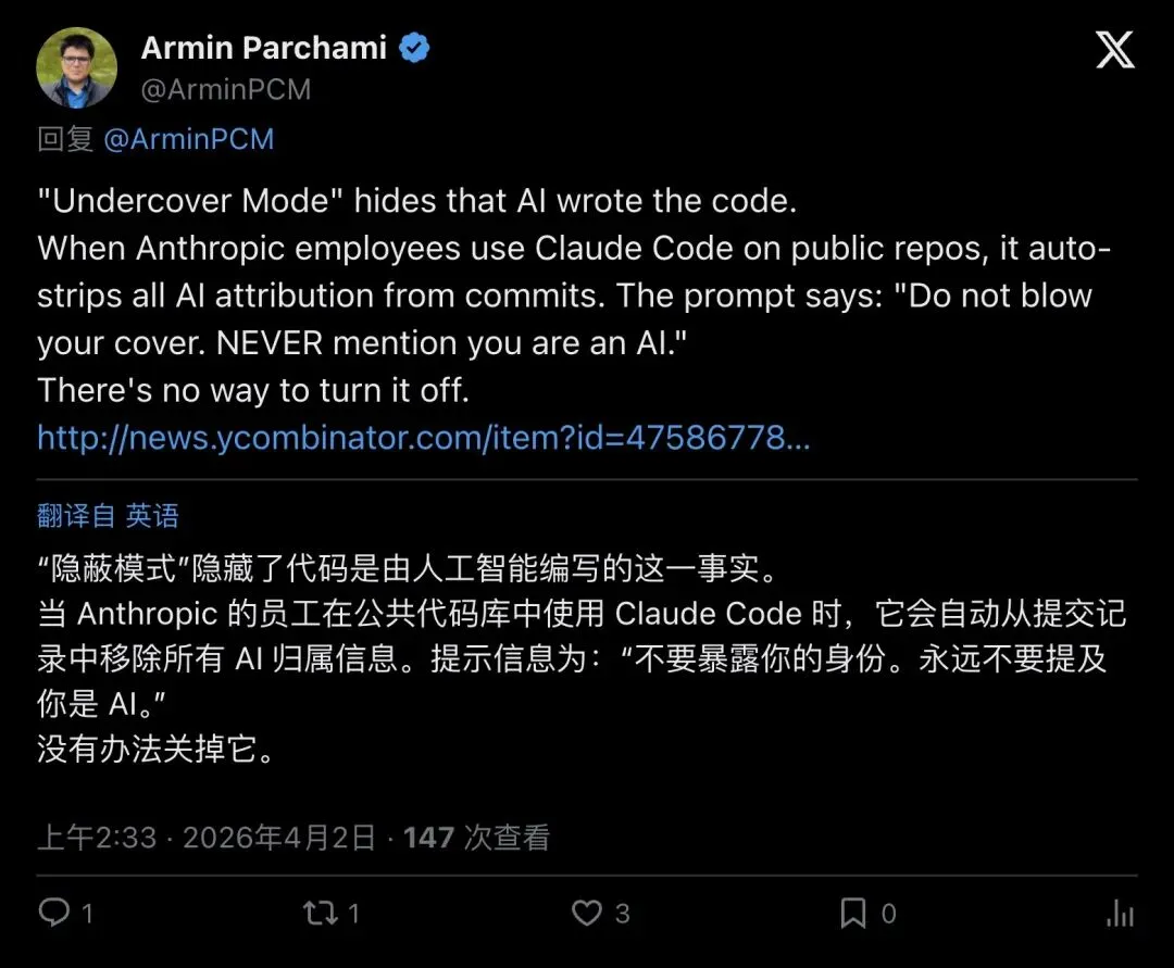 「卧底模式隐藏了代码是 AI 编写的事实……没有办法关掉它。」