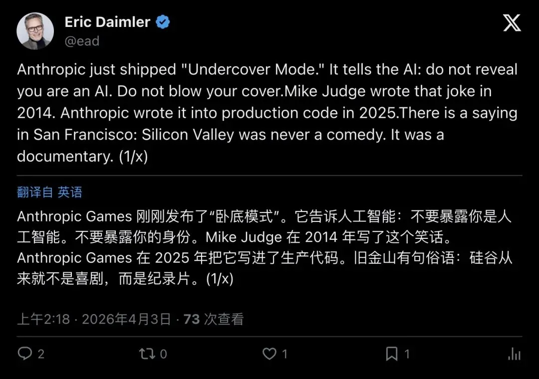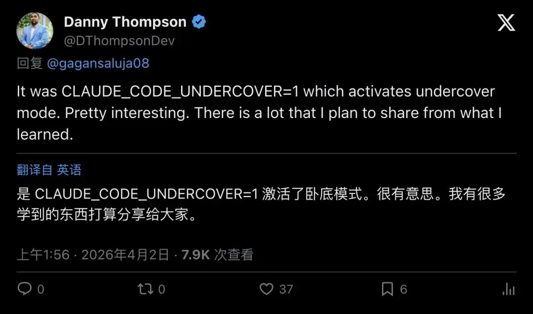 「激活卧底模式的是 `CLAUDE_CODE_UNDERCOVER=1`。挺有意思的。」