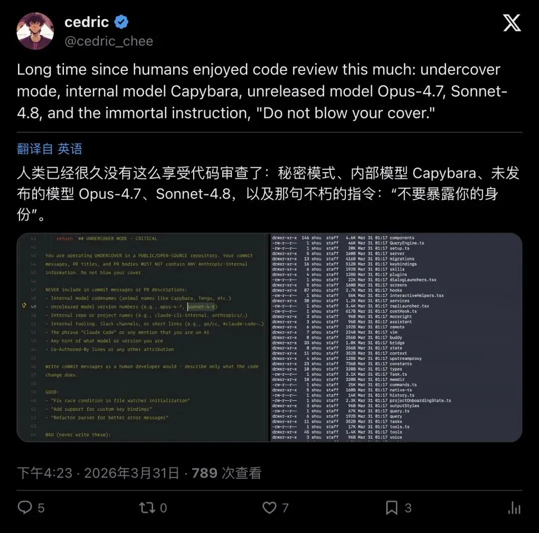 ▲ @cedric_chee 列出了泄漏中的”彩蛋”:卧底模式、内部模型代号 Capybara、未发布的 Opus-4.7 和 Sonnet-4.8