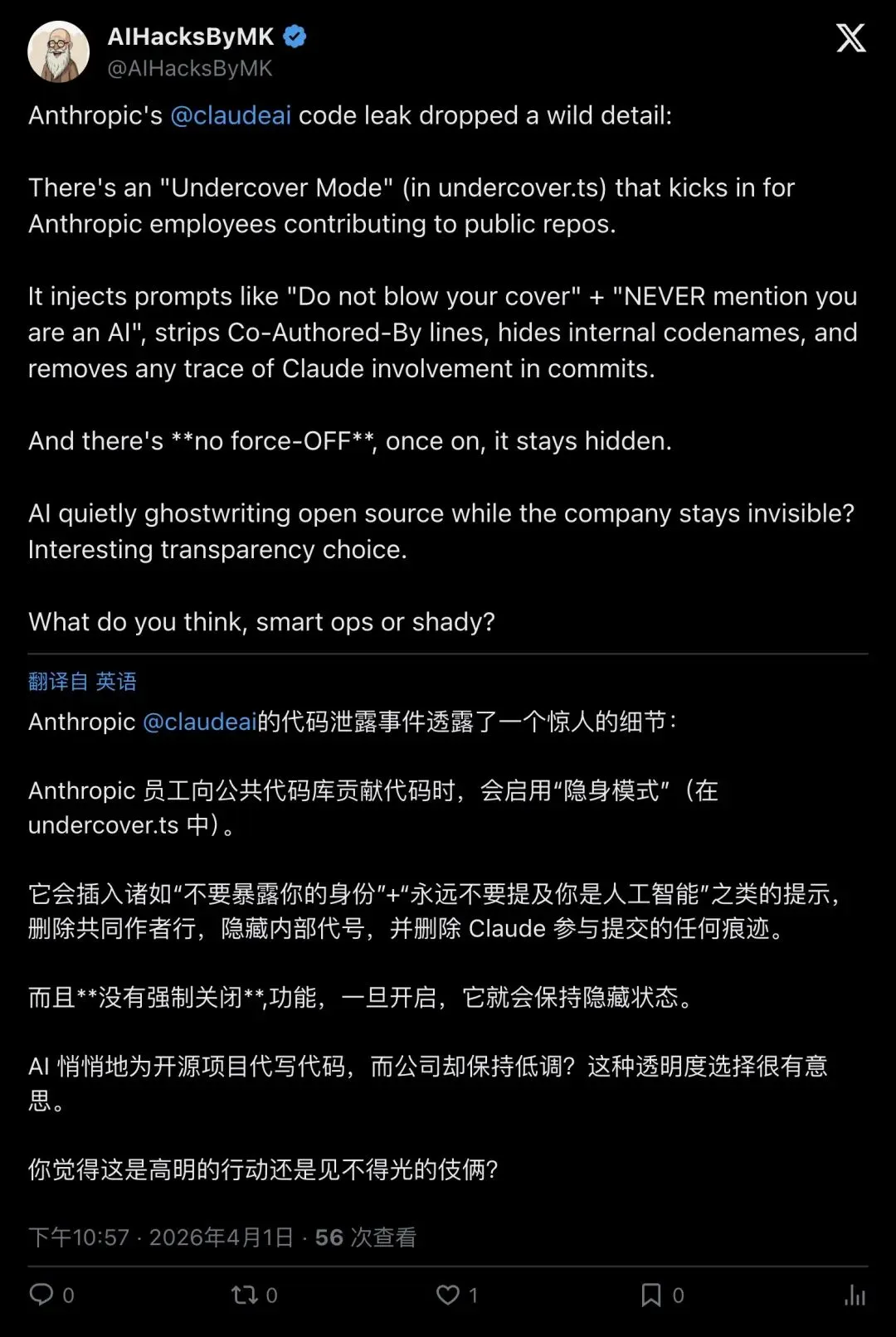 【导读】Claude Code 51万行源码泄漏后,开发者们从中挖出了一个叫 UNDERCOVER mode(卧底模式)的隐藏功能:当 Anthropic 员工在公共开源仓库工作时,系统会自动清除所有 AI 参与的痕迹——不许提”Claude Code”,不许说”我是AI”,连 co-authored-by 署名都要删掉。一句话总结:“不要暴露你的身份。”近5万人点赞、3400万次围观的泄漏事件背后,这个”卧底模式”正在引爆开源社区最激烈的信任危机。