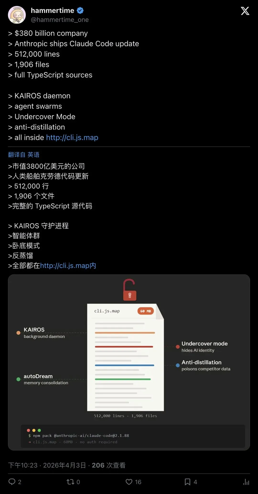 ▲ 3800亿美元的公司,512000行代码、卧底模式、agent 集群、反蒸馏机制……全部藏在一个 cli.js.map 文件里