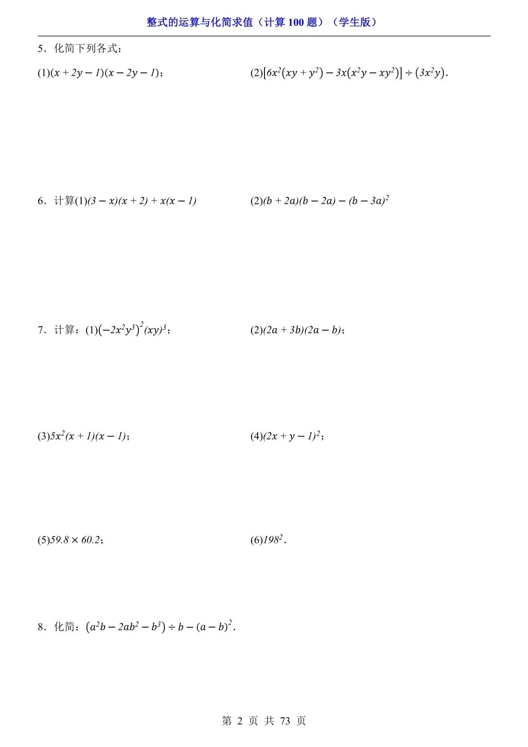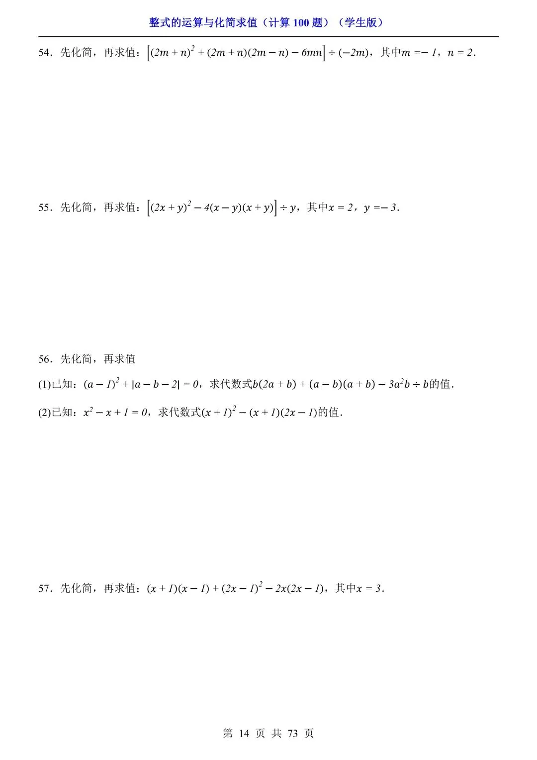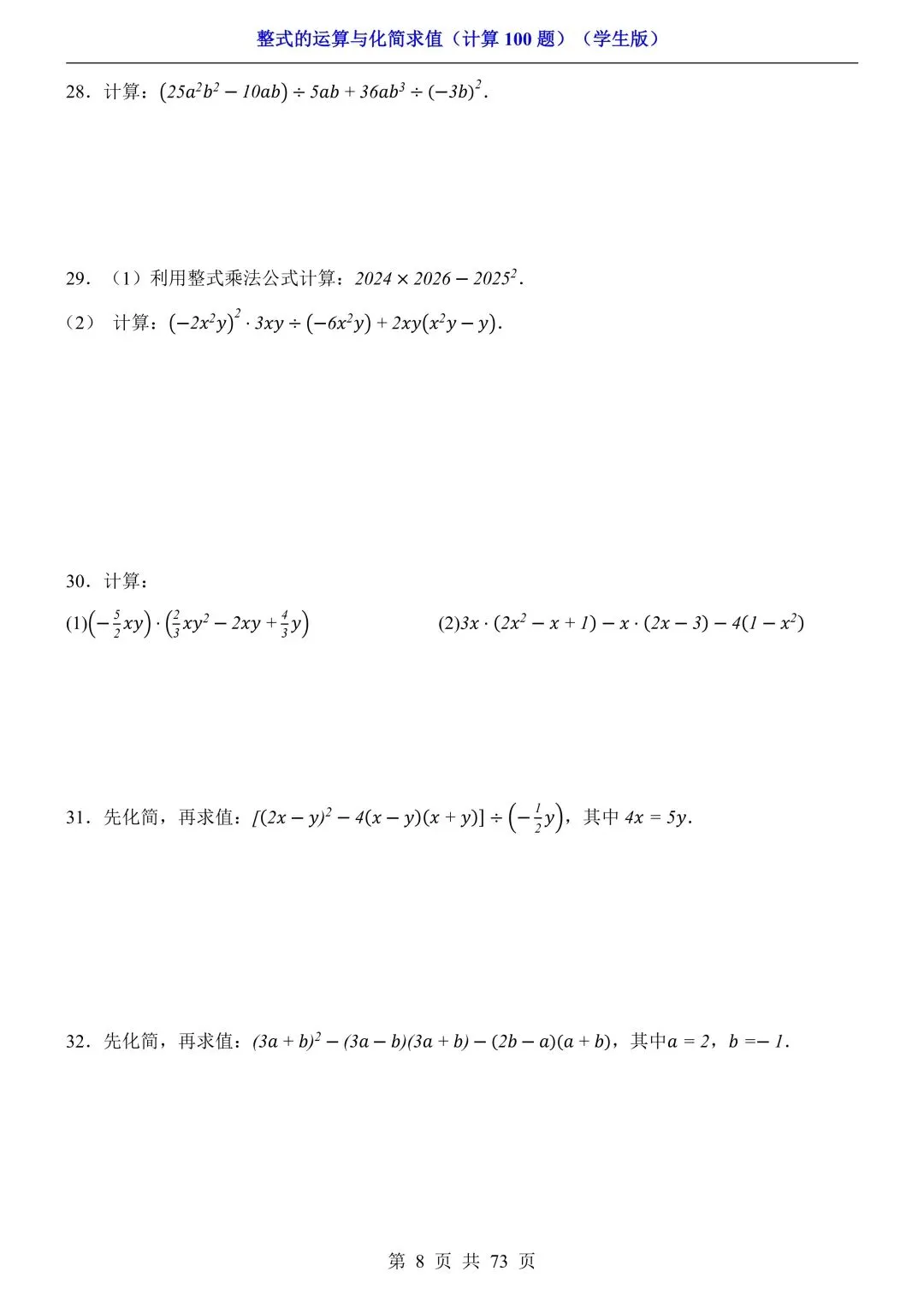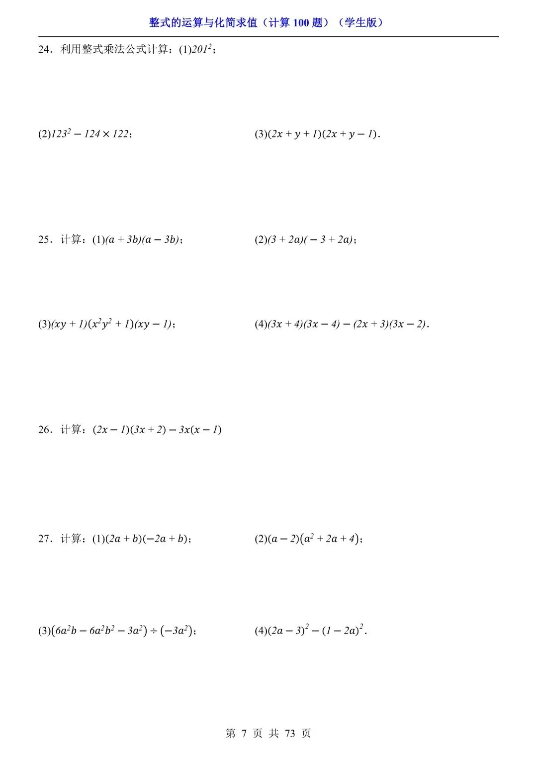 2026新版初一七年级下册数学《整式的运算与化简求值》专项练习计算100题,电子版