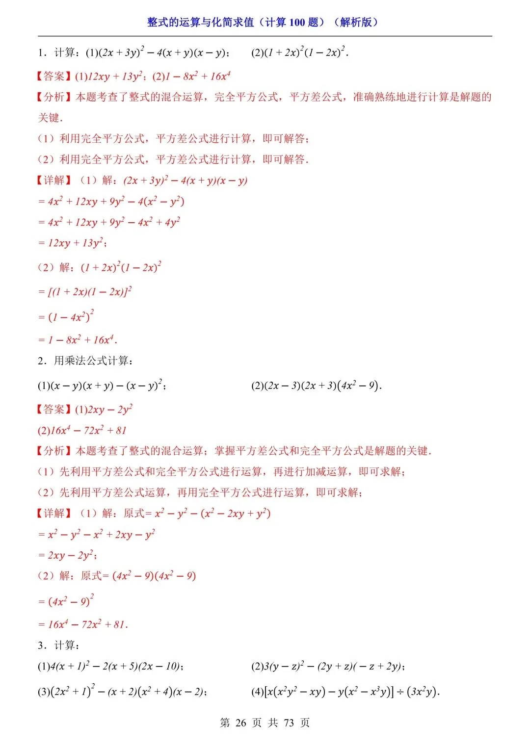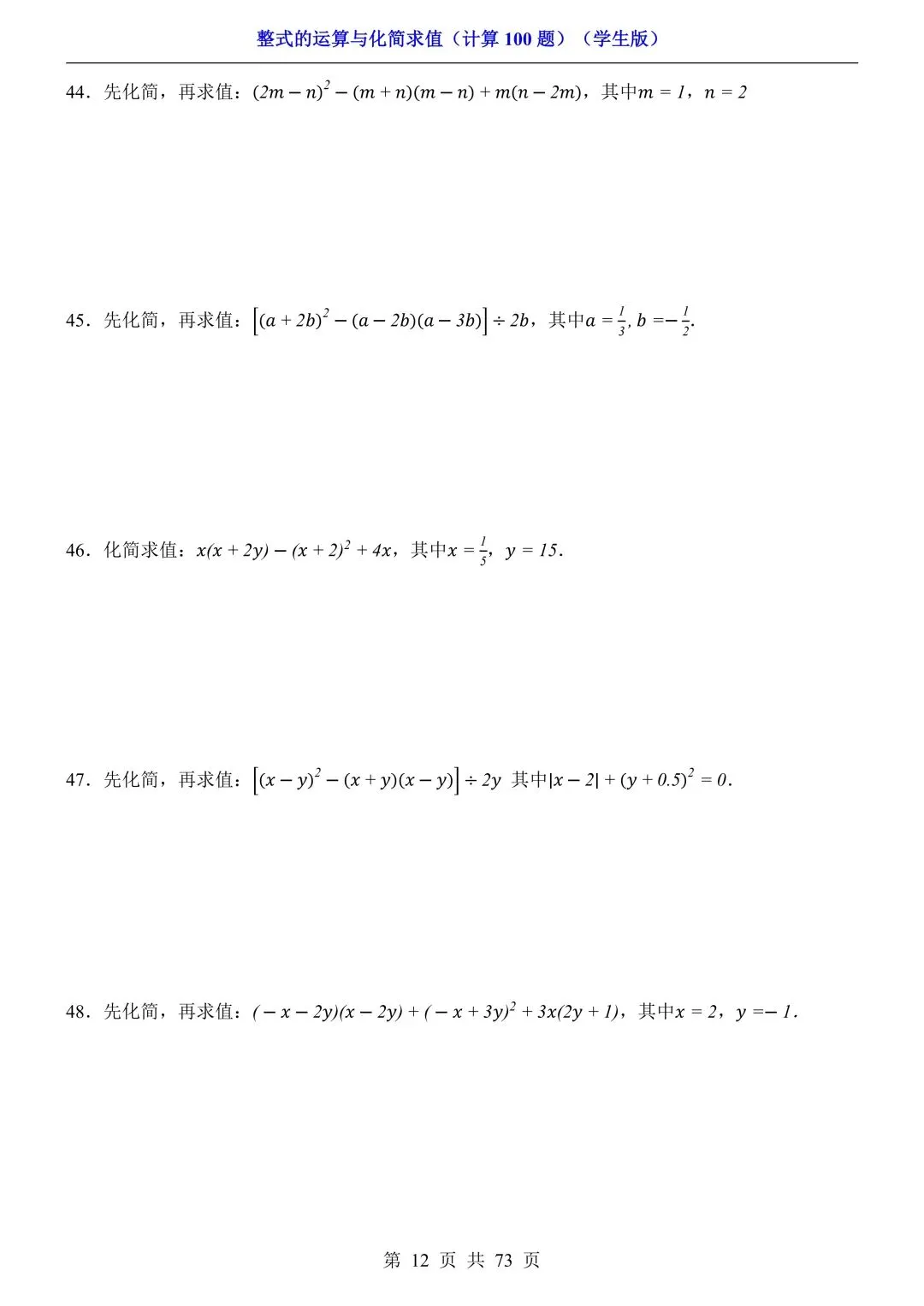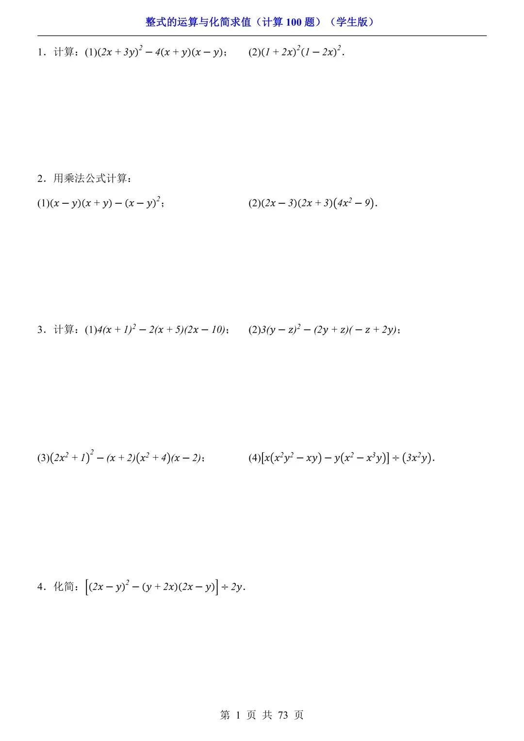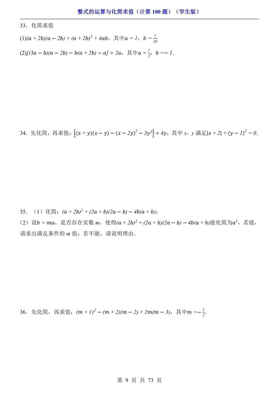 2026新版初一七年级下册数学《整式的运算与化简求值》专项练习计算100题,电子版