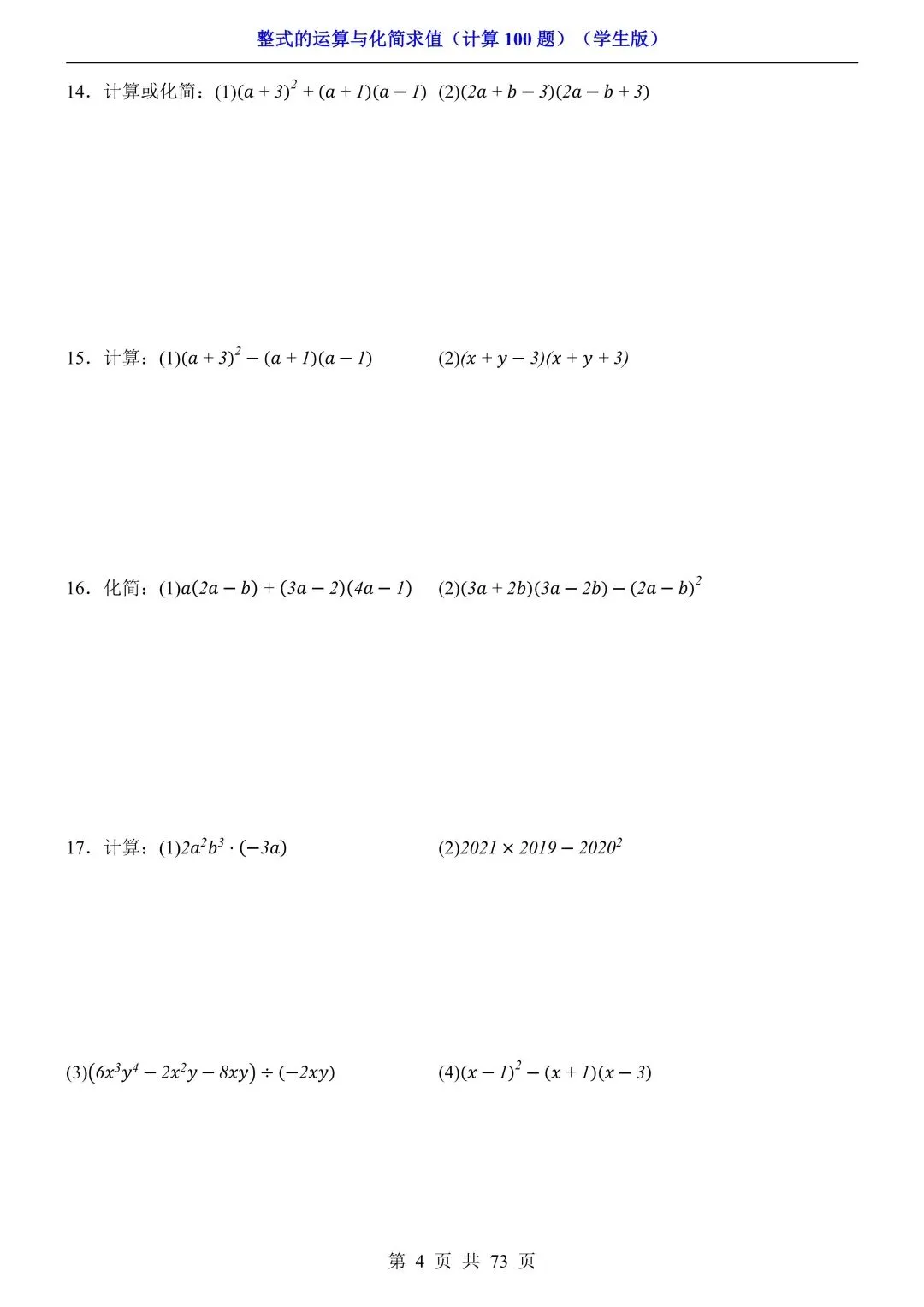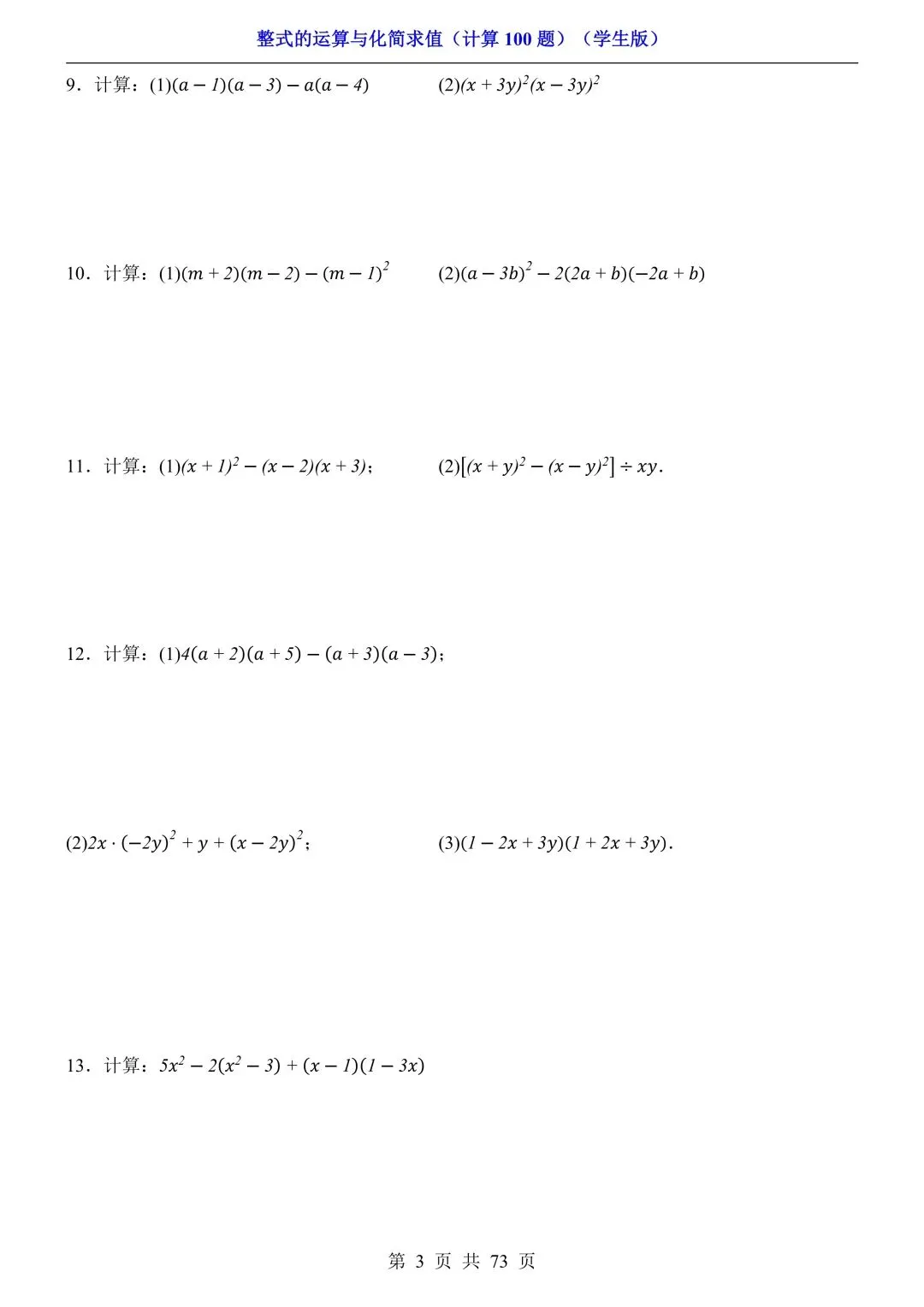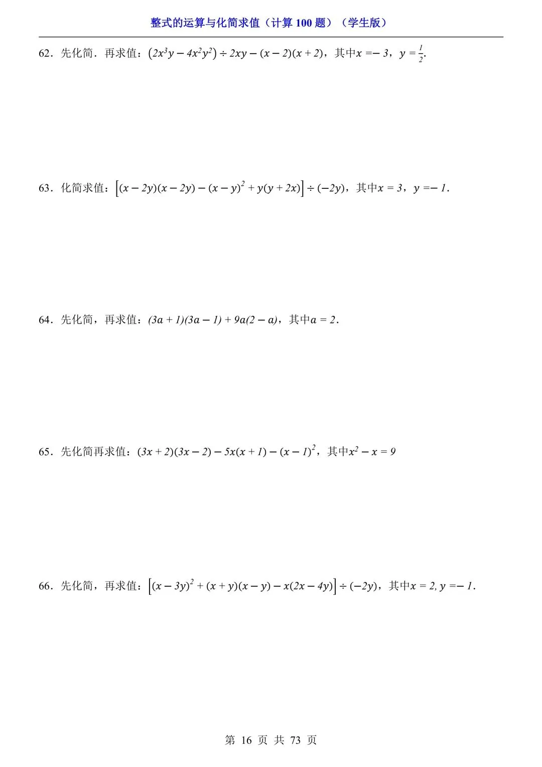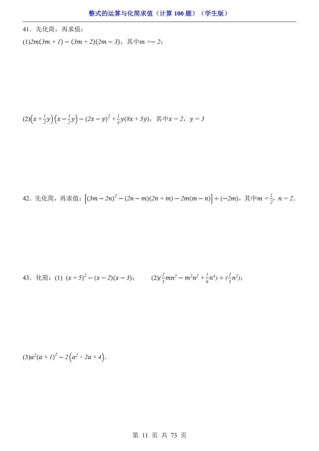 2026新版初一七年级下册数学《整式的运算与化简求值》专项练习计算100题,电子版