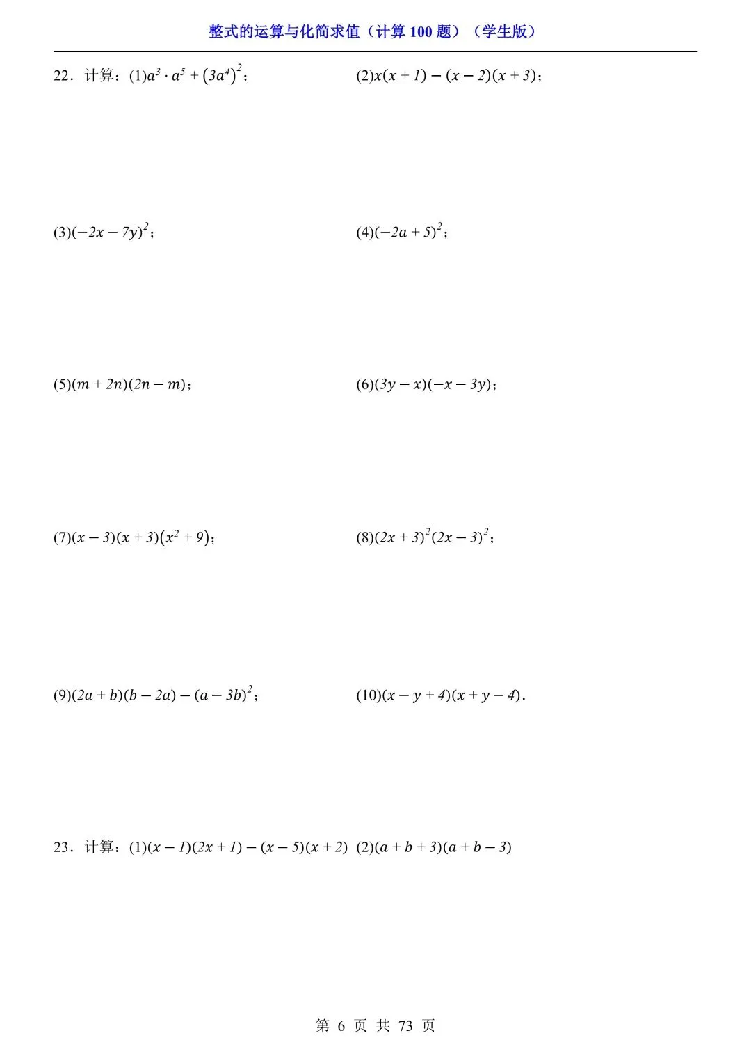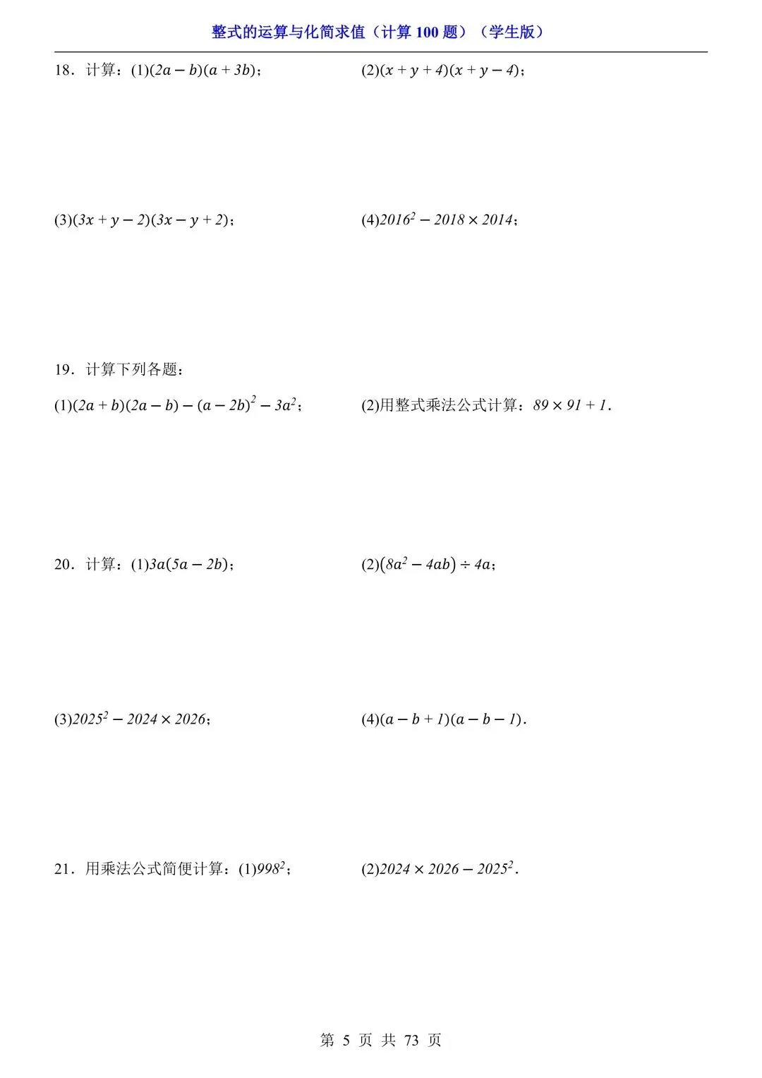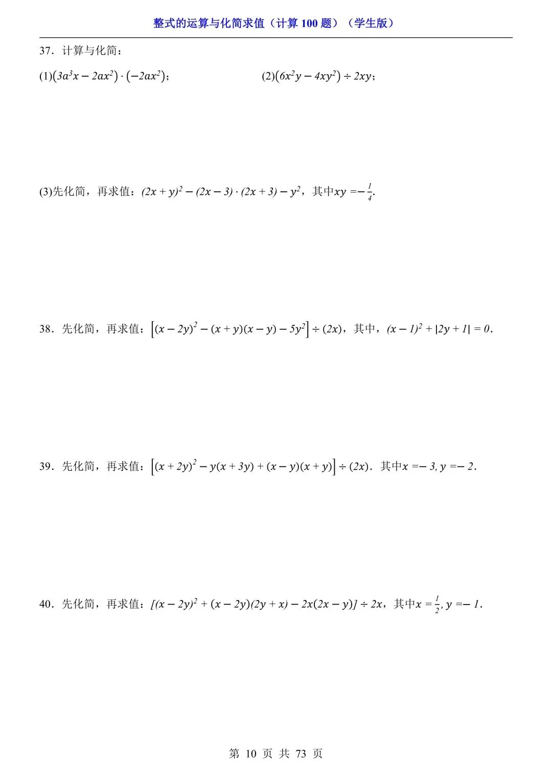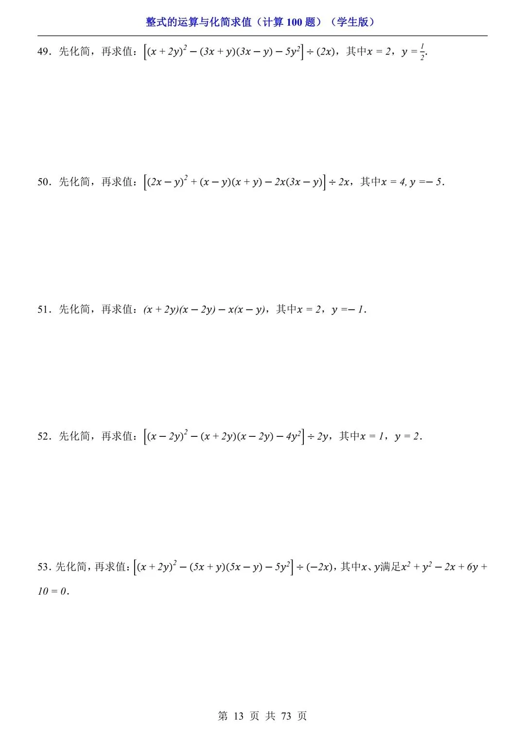 2026新版初一七年级下册数学《整式的运算与化简求值》专项练习计算100题,电子版