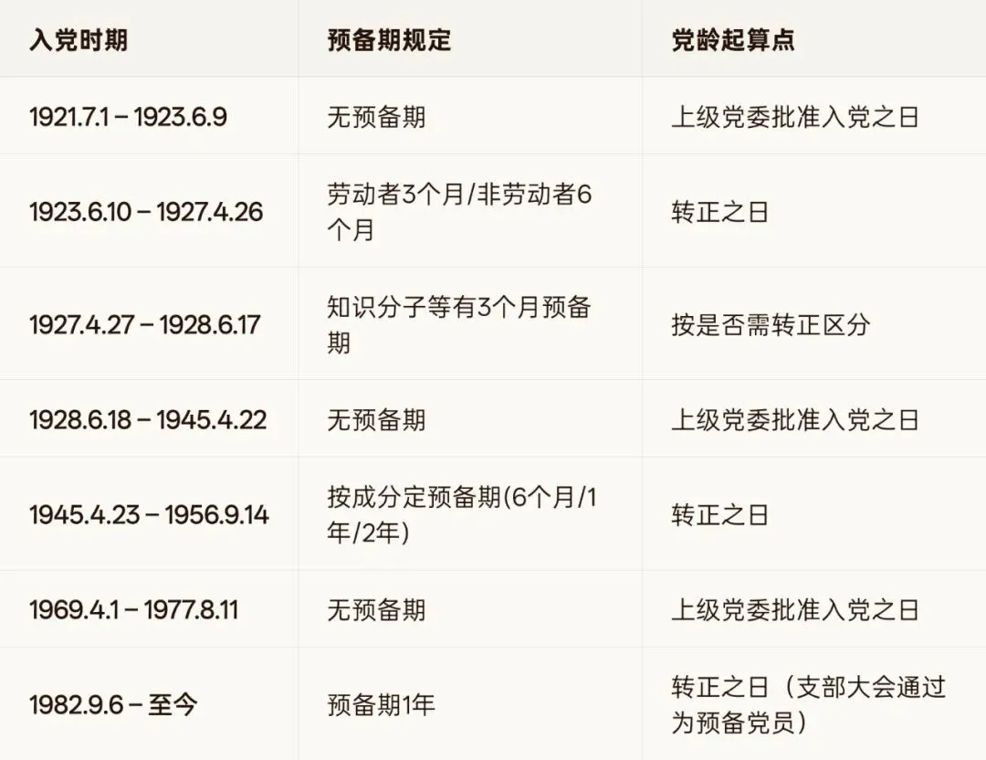 – 起算时间:从预备期满转为正式党员之日算起。预备党员虽有党籍(资格),但在预备期内不计算党龄。