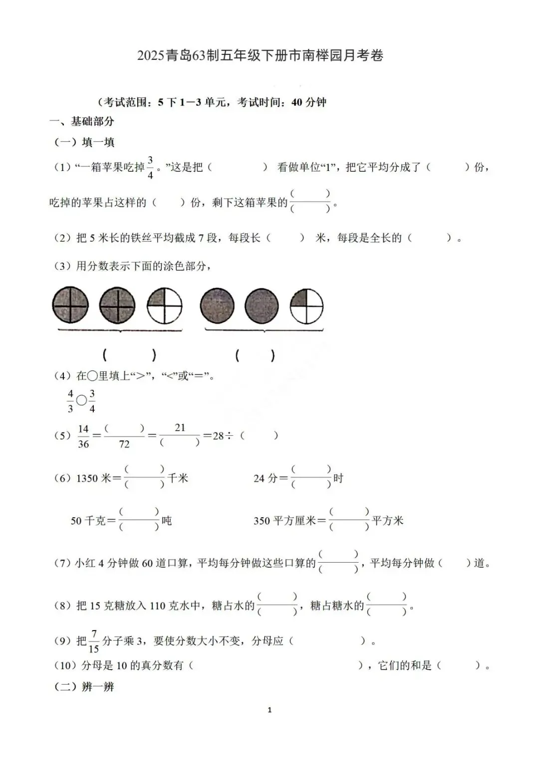 家有青岛南区五年级学生的家长有福啦!想精准把握孩子数学学习情况?我们为您准备了贴合教学进度的五年级下册数学月考卷。