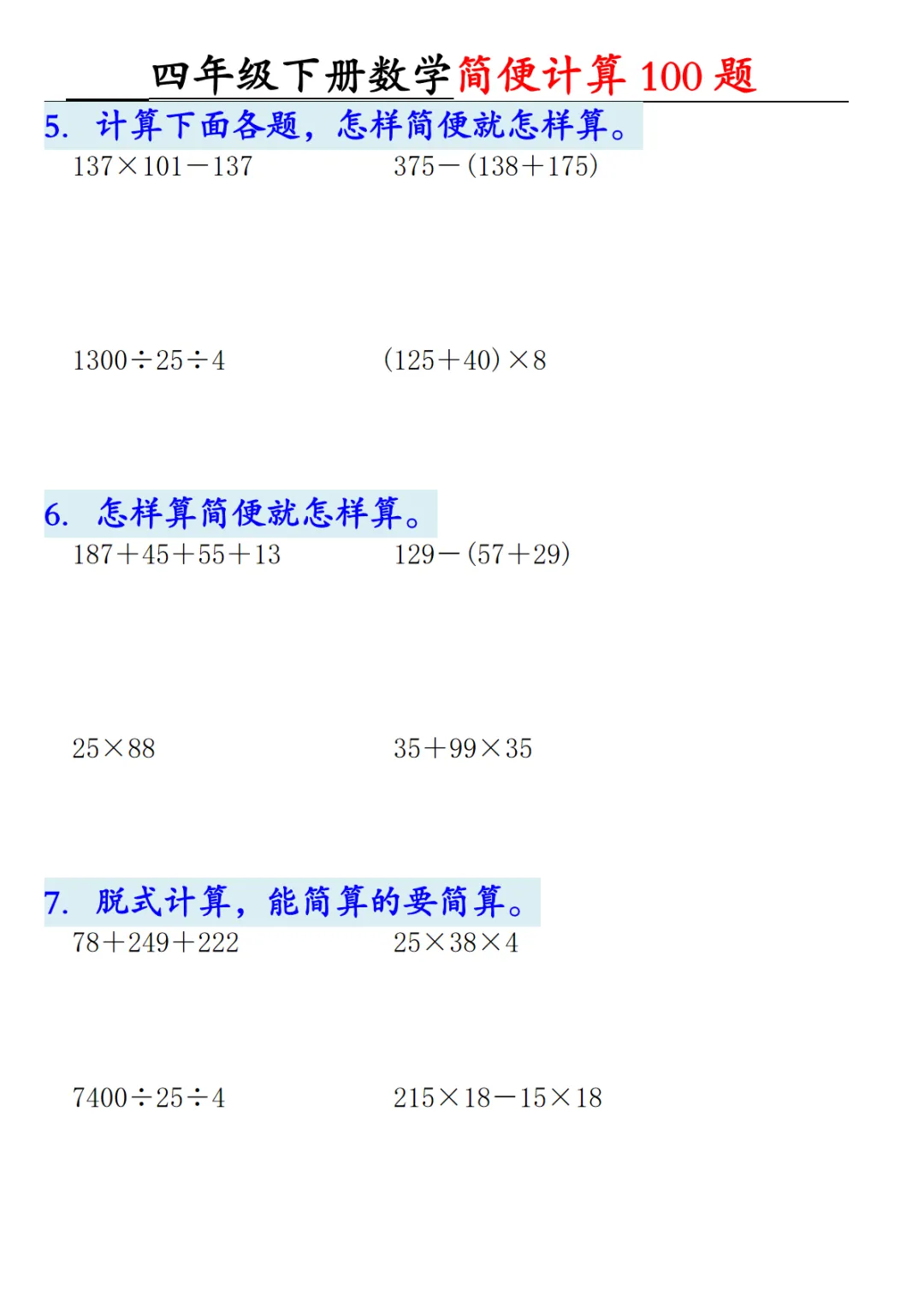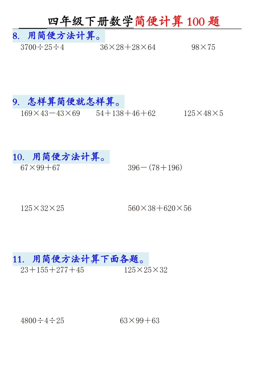 【高清电子版】四年级下册数学【2026版-简便100题含答案-12页】