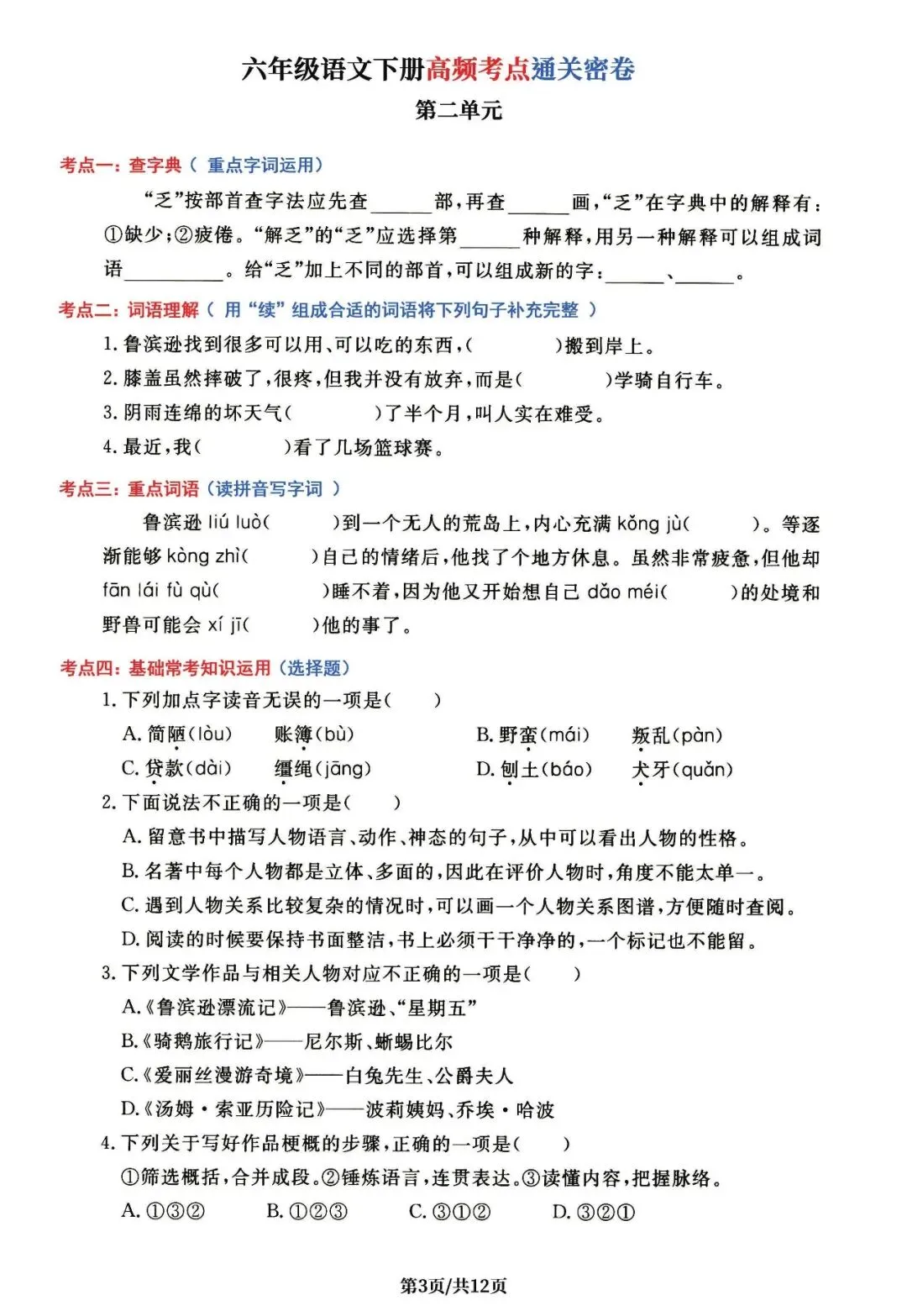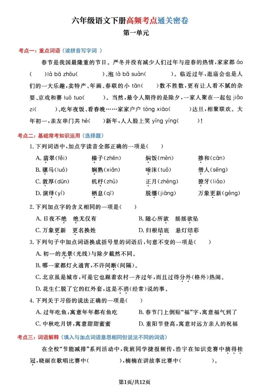 六下丨语文 1-6单元高频考点通关密卷