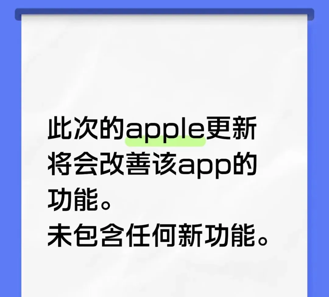最近不少iPhone用户在打开App Store更新应用时,都发现了一个高度雷同的现象:大量App的更新日志不再标注具体的功能迭代、bug修复细节,而是统一用一句“此次Apple更新将会改善该App的功能,未包括任何新功能”一笔带过。不少用户对此感到困惑,甚至调侃“开发者集体摆烂”“所有App都停止创新了”。但事实上,这句看似敷衍的标准化话术,绝非简单的偷懒,而是App生态中平台规则、开发逻辑、用户体验多方博弈的必然结果。