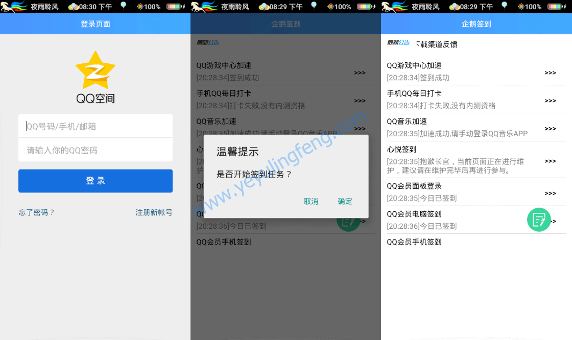 企鹅签到助手操作简单灵活无需繁琐的操作,缺陷就是支持的功能比较少,作为一款免费的工具就别要自行车了。关于一直被议论的账号安全问题,以前用同类型工具并未出现异常现象,当然也不排除个别喝水都塞牙的悲催用户,风险虽小但还是建议小号使用。