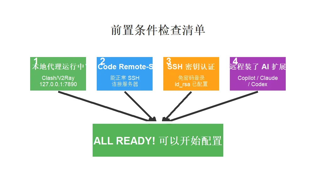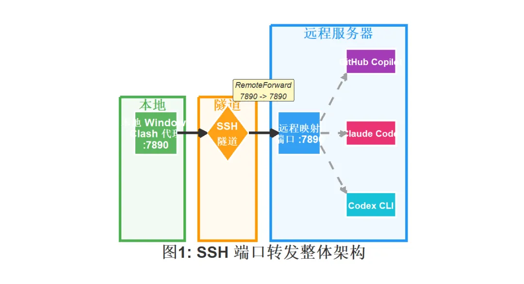 本文目标:一条线搞定「本地 Clash 代理 → SSH 隧道 → 远程服务器 → AI 编程助手联网」,让你的 Copilot / Claude Code / Codex 在远程环境畅通无阻。