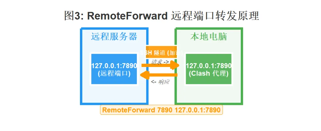 RemoteForward的意思是”把远程服务器上的某个端口,转发到本地”。这样远程服务器上访问127.0.0.1:7890,实际上就是在访问你本地电脑的 Clash。