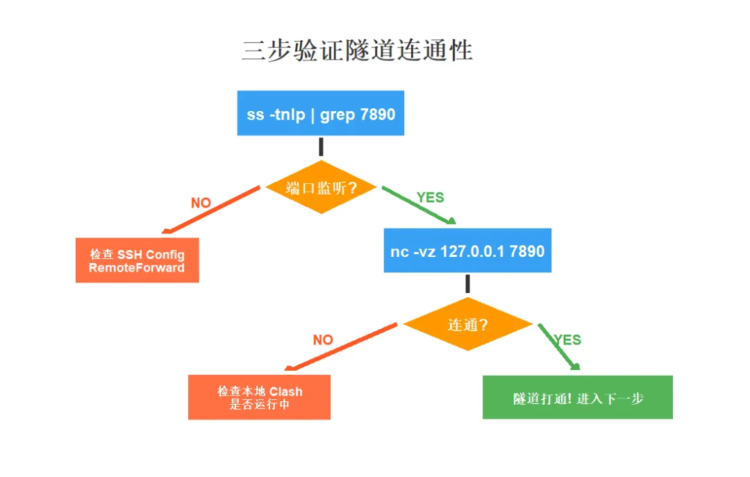 # 1. 检查远程 7890 端口是否在监听ss -tnlp | grep 7890# 2. 测试端口连通性nc -vz 127.0.0.1 7890# 3. 终极验证:通过代理访问外网curl -x http://127.0.0.1:7890 https://api.openai.com -v