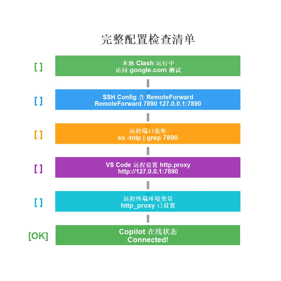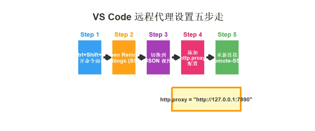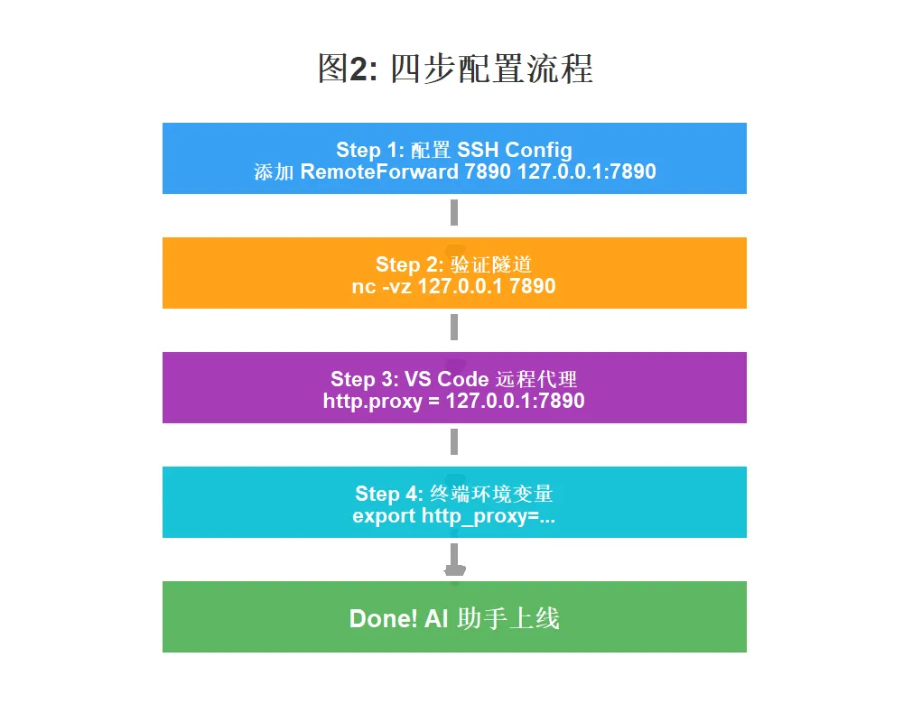 # SSH Config 一行核心RemoteForward 7890 127.0.0.1:7890# VS Code 远程设置三行"http.proxy": "http://127.0.0.1:7890""http.proxySupport": "on"# 终端环境变量两行export http_proxy=http://127.0.0.1:7890export https_proxy=http://127.0.0.1:7890