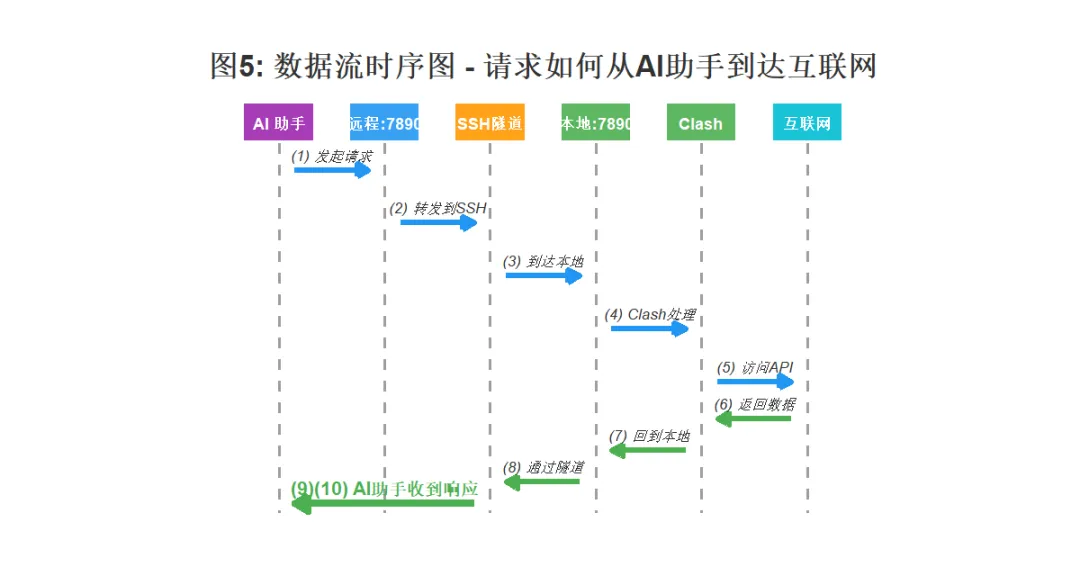 127.0.0.1:7890→ SSH 隧道(加密)→ 本地 Clash127.0.0.1:7890→ 互联网