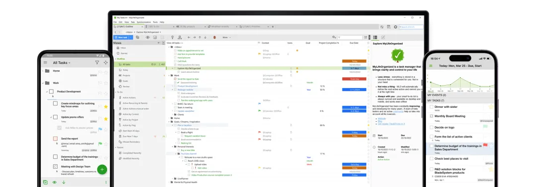 打个比方:普通的待办 App 像一个记事本,你往上记什么就是什么。而 MyLifeOrganized(MLO) 像一个指挥中心,你把所有任务丢进去,它会自动帮你分析、排序、过滤,最后只给你一张“现在该做什么”的清单。
