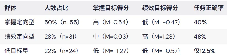 📌 核心发现:绩效定向型学生正确率最高(48%),掌握定向型紧随其后(40%),而低目标学习者仅有12.5%的学生能找到最优答案——差距悬殊。这说明AI工具不能弥补动机的缺失,它不是”学习兜底器”。