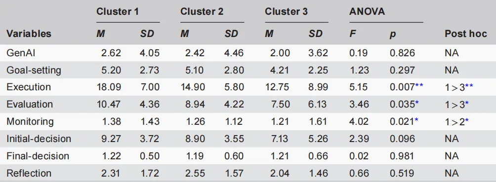 RQ2:用单因素方差分析 + Bonferroni 事后检验,对比不同剖面学生的 GenAI 使用频率和各 SRL 行为频率;