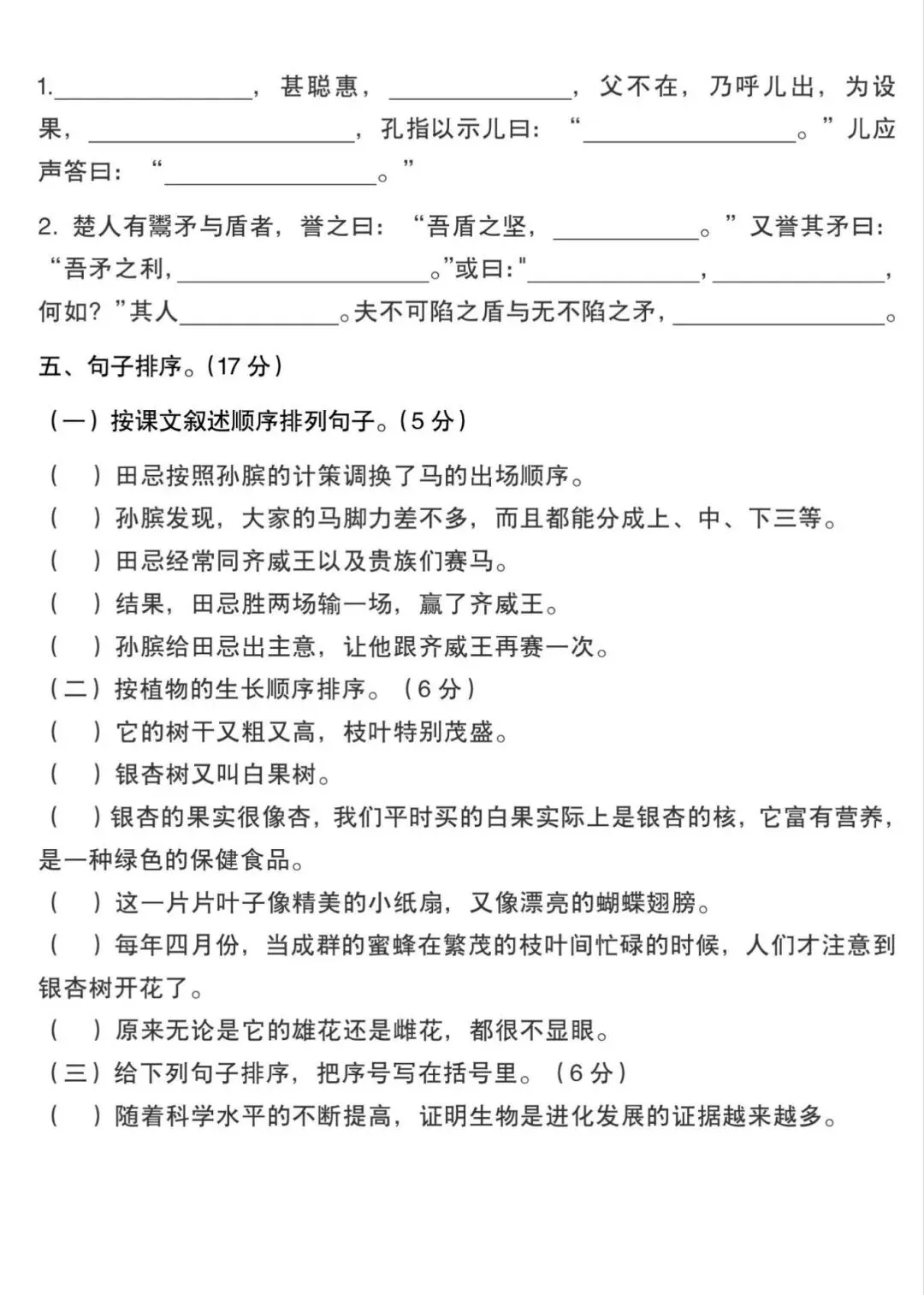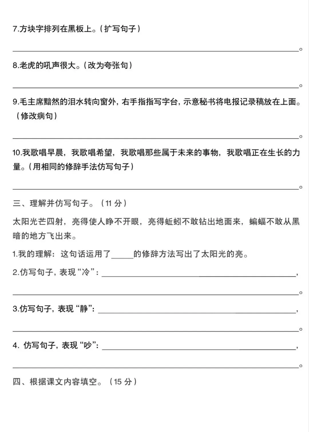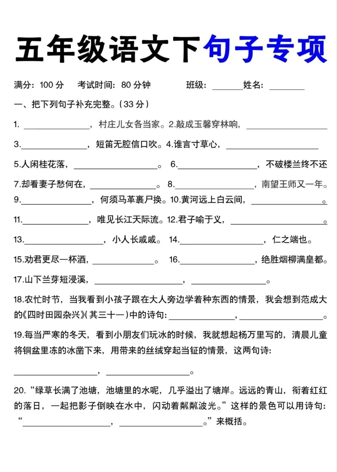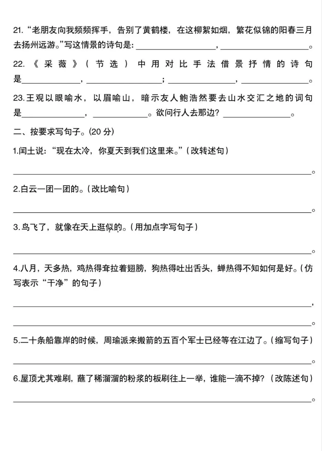五年级下册语文句子专项训练,电子版可下载打印