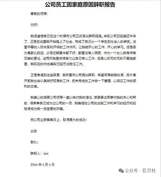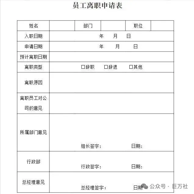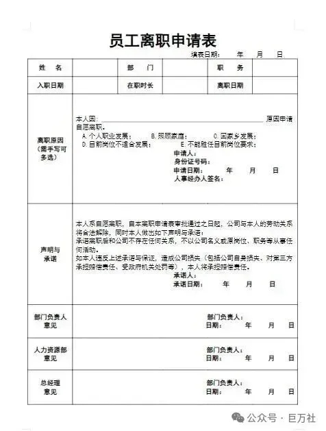 员工辞职信离职申请表模板下载