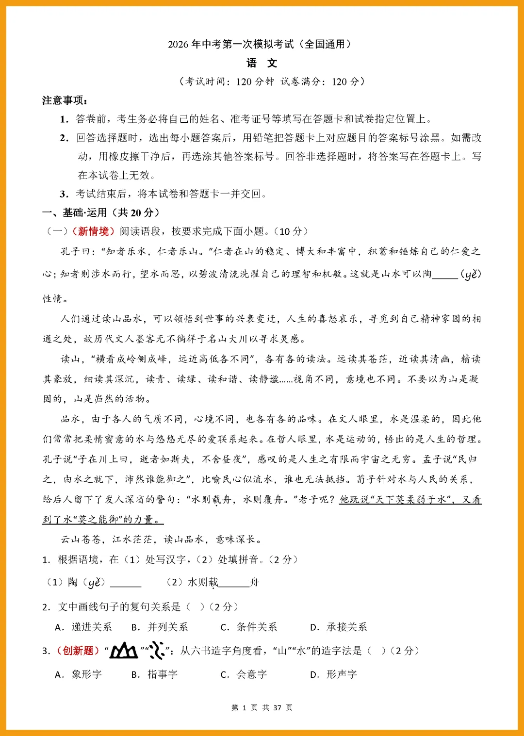各位家长注意啦!2026 年中考语文第一次模拟考试(全国通用版)新鲜出炉,全套共 37 页,专为初三学子量身打造。试卷紧扣最新考纲,涵盖基础积累、现代文阅读及写作等核心板块,题型新颖且解析详尽。孩子通过实战演练,不仅能精准查漏补缺,还能提前适应考场节奏,有效提升应试信心与得分能力。机会难得,需要的家长赶紧下载打印,让孩子趁热打铁练一练,为明年中考抢占先机!