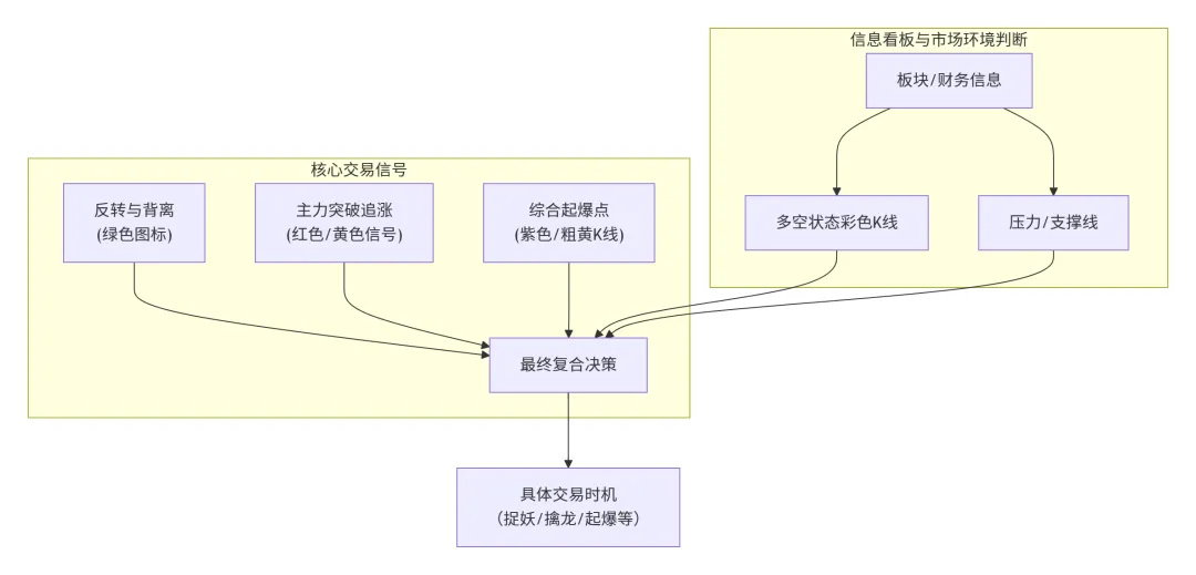 此公式结构复杂,但目标明确:在同一张K线图上,通过线条、彩色K线、图标、文字标注等多种形式,直观展示多维度交易信号。其核心逻辑是综合判断趋势、位置、资金、形态等多个因素,给出不同性质的交易提示。下图清晰地展示了其核心模块与信号体系: