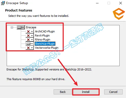 8.这里以Enscape安装到SketchUp上为例子,所以将除了SketchUp-Plugin的其他平台都选择X,只选中SketchUp-Plugin,然后点击【Install】
